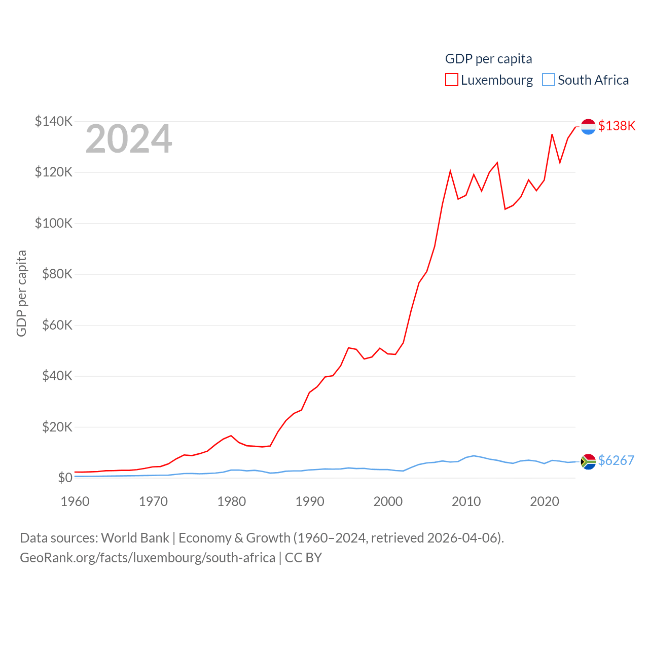 By GDP, Luxembourg ranks 74/197 ($93.3B) and South Africa ranks 40/197 ($401B). By GDP per capita, Luxembourg ranks 3/197 ($137,782), while South Africa ranks 111/197 ($6,267).