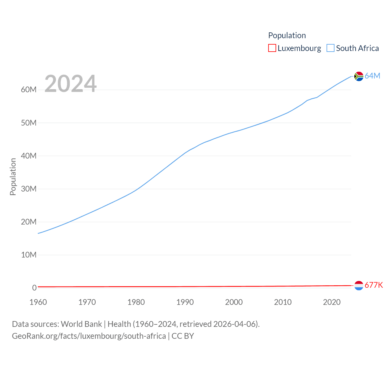 Luxembourg has a population of 677K (ranked 164/197), compared with 64M in South Africa (ranked 24/197). Luxembourg's land area is 994 sq mi versus 468,377 sq mi for South Africa (ranked 169th vs. 24th).