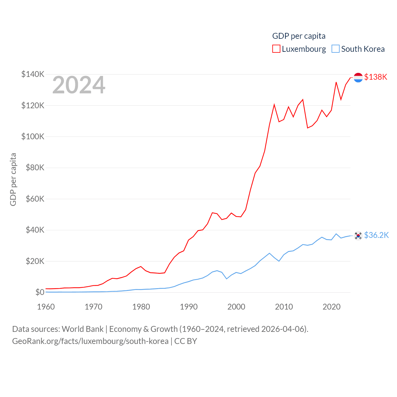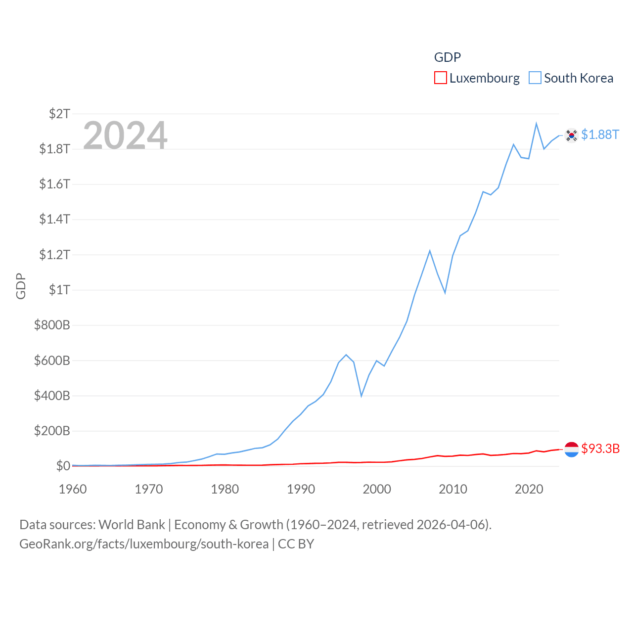 By GDP, Luxembourg ranks 74/197 ($93.3B) and South Korea ranks 12/197 ($1.88T). By GDP per capita, Luxembourg ranks 3/197 ($137,782), while South Korea ranks 31/197 ($36,239).