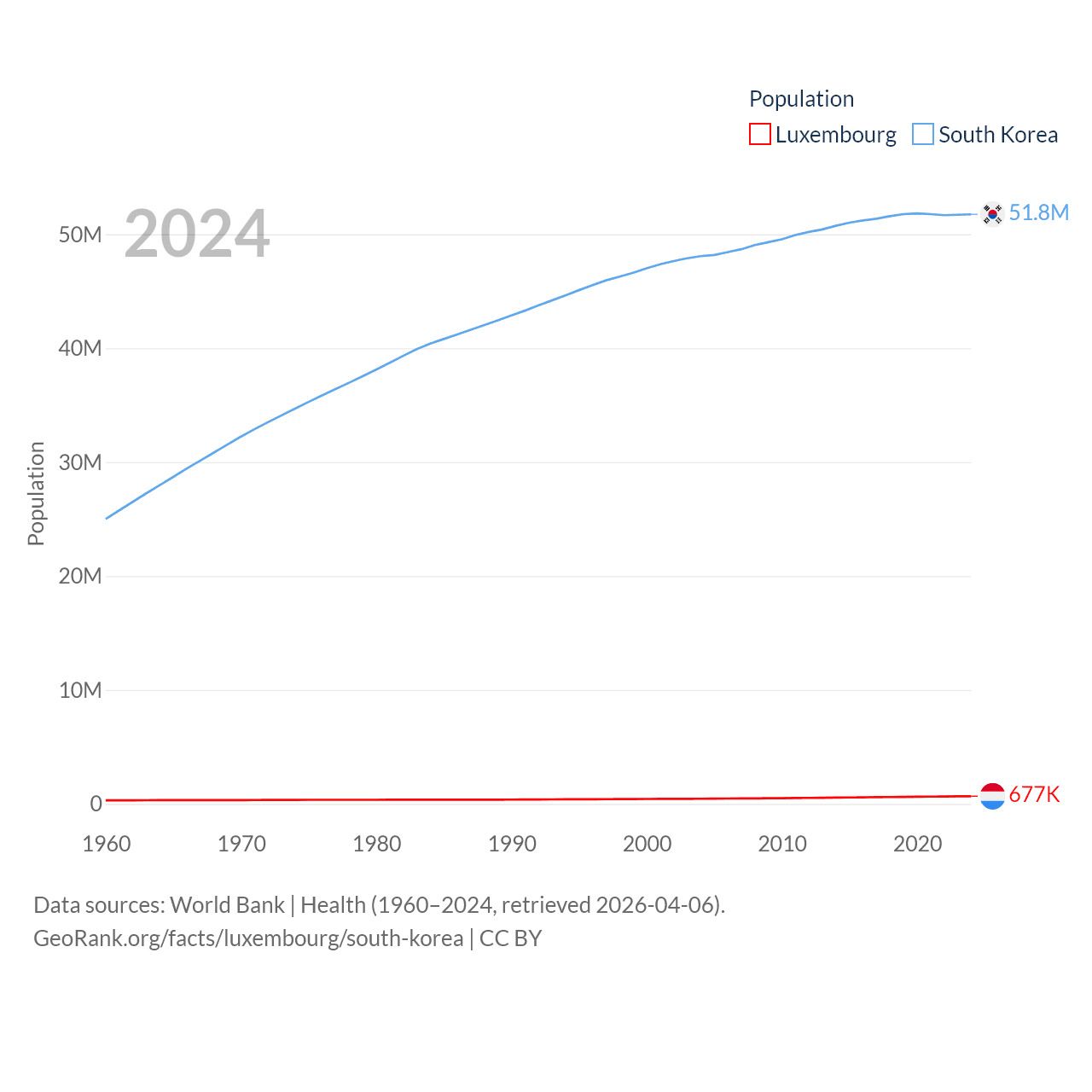 Luxembourg has a population of 677K (ranked 164/197), compared with 51.8M in South Korea (ranked 29/197). Luxembourg's land area is 994 sq mi versus 37,684 sq mi for South Korea (ranked 169th vs. 105th).