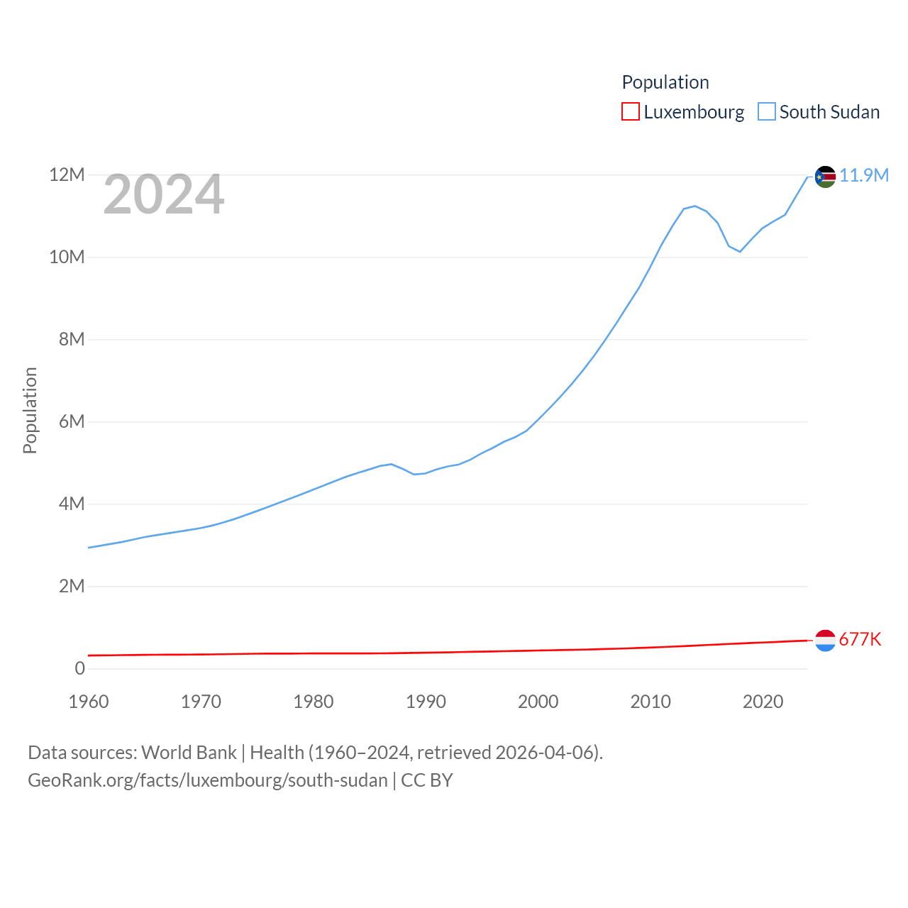 Luxembourg has a population of 677K (ranked 164/197), compared with 11.9M in South Sudan (ranked 81/197). Luxembourg's land area is 994 sq mi versus 243,990 sq mi for South Sudan (ranked 169th vs. 41st).
