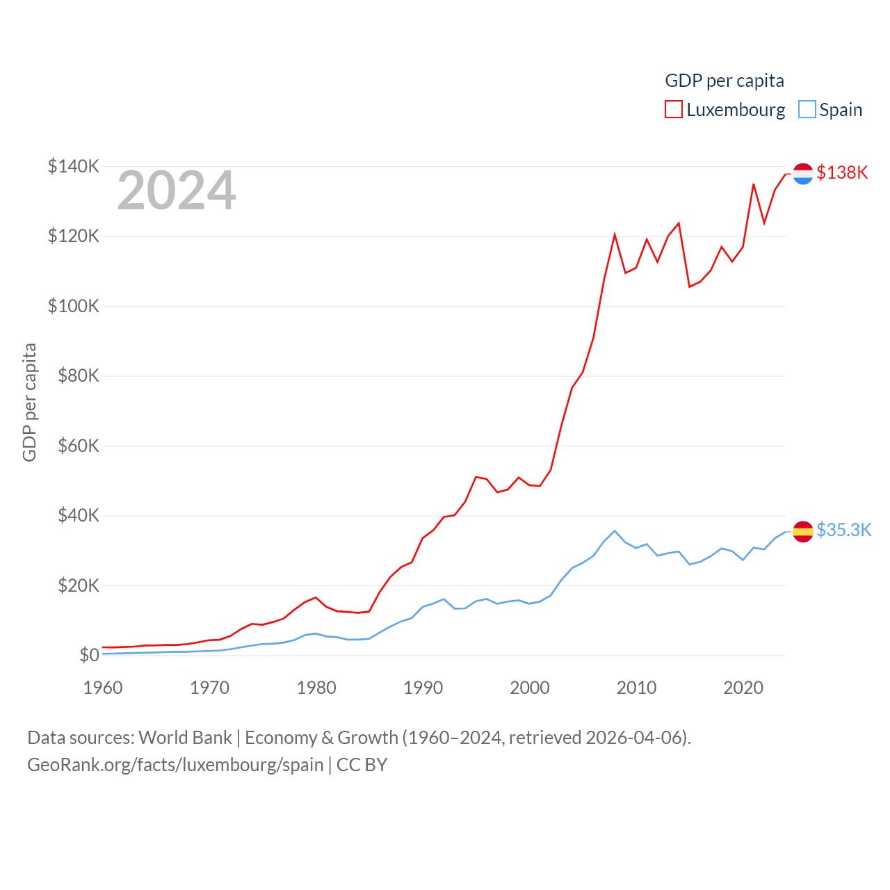 By GDP, Luxembourg ranks 74/197 ($93.3B) and Spain ranks 15/197 ($1.73T). By GDP per capita, Luxembourg ranks 3/197 ($137,782), while Spain ranks 32/197 ($35,327).
