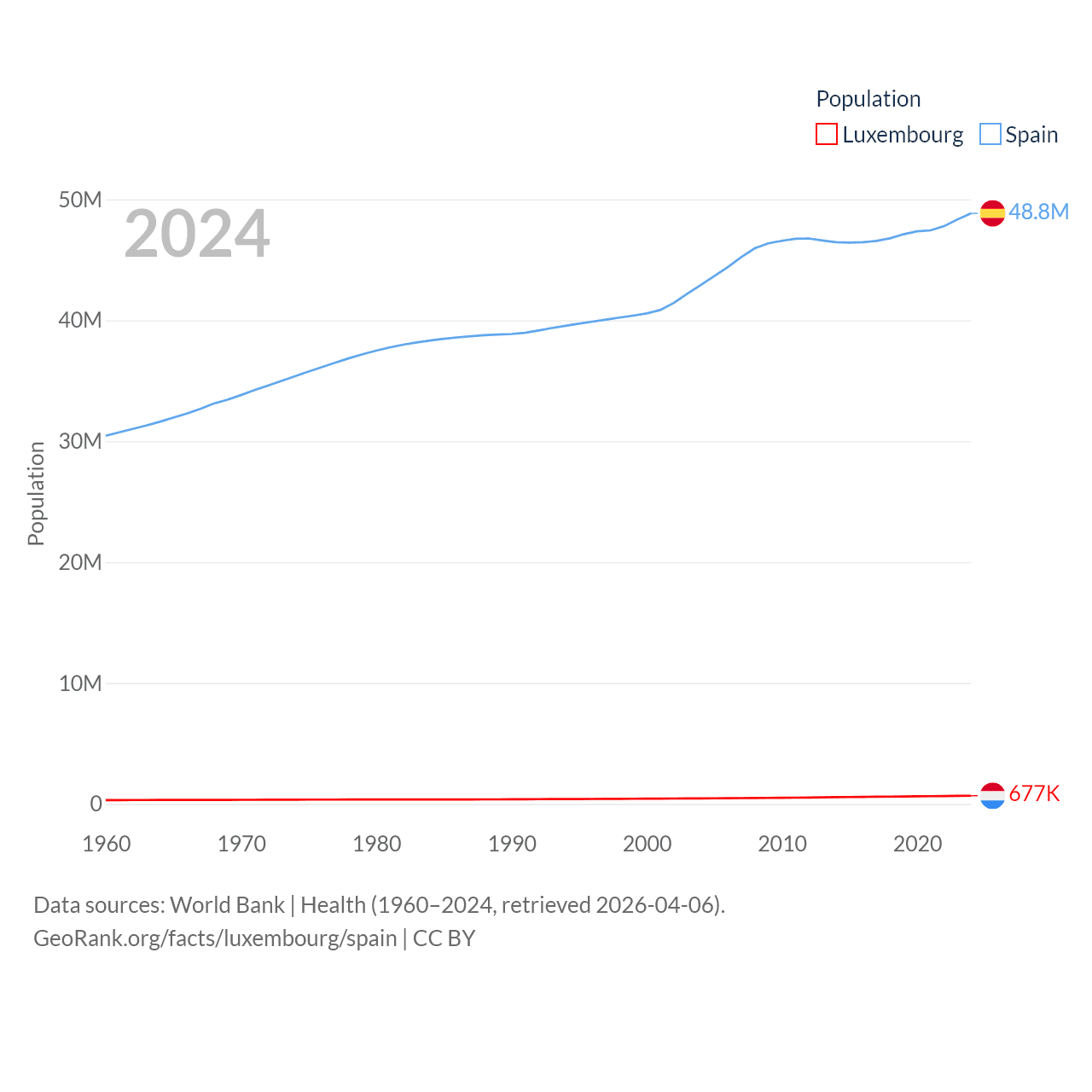 Luxembourg has a population of 677K (ranked 164/197), compared with 48.8M in Spain (ranked 32/197). Luxembourg's land area is 994 sq mi versus 192,934 sq mi for Spain (ranked 169th vs. 51st).