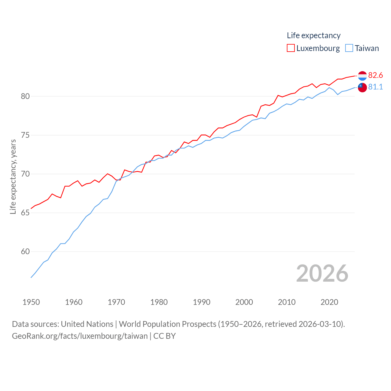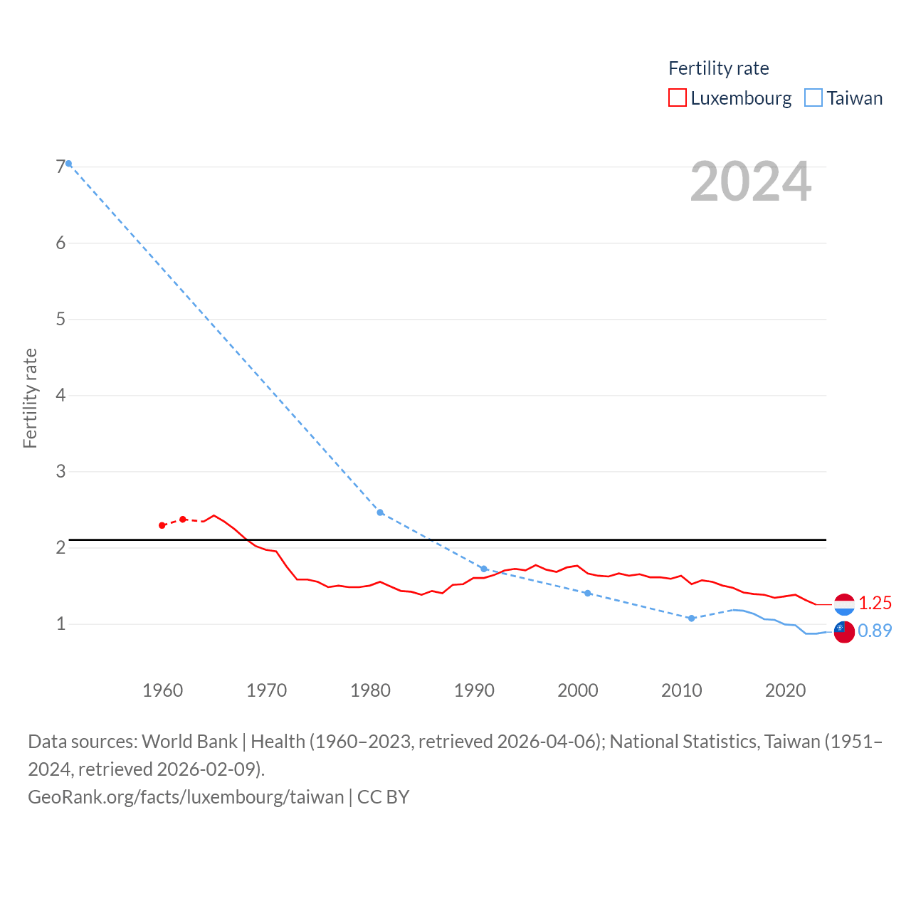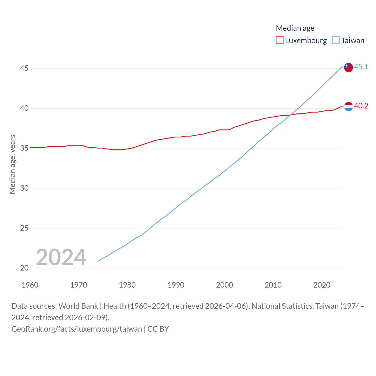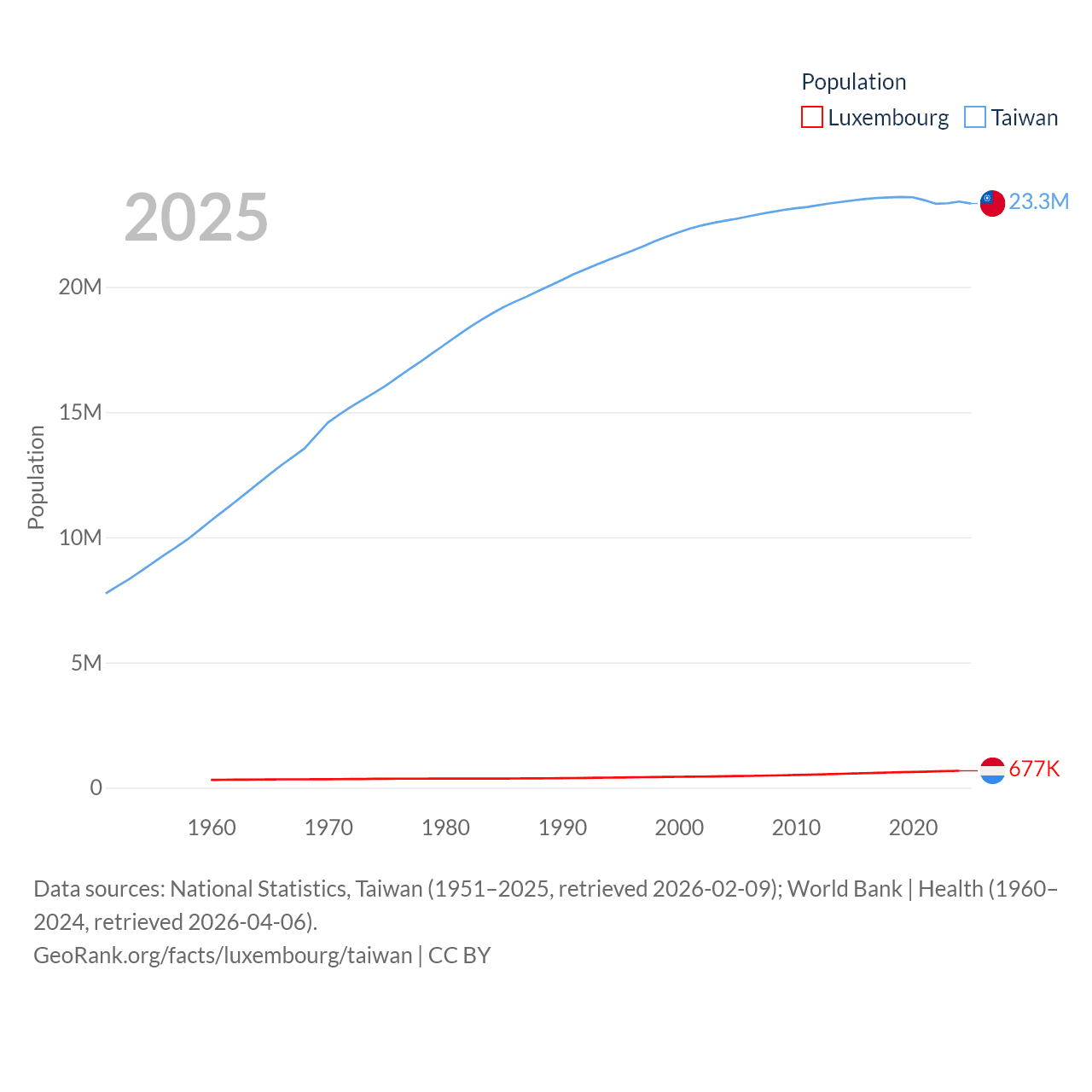 Luxembourg has a population of 677K (ranked 164/197), compared with 23.3M in Taiwan (ranked 60/197). Luxembourg's land area is 994 sq mi versus 13,976 sq mi for Taiwan (ranked 169th vs. 133rd).
