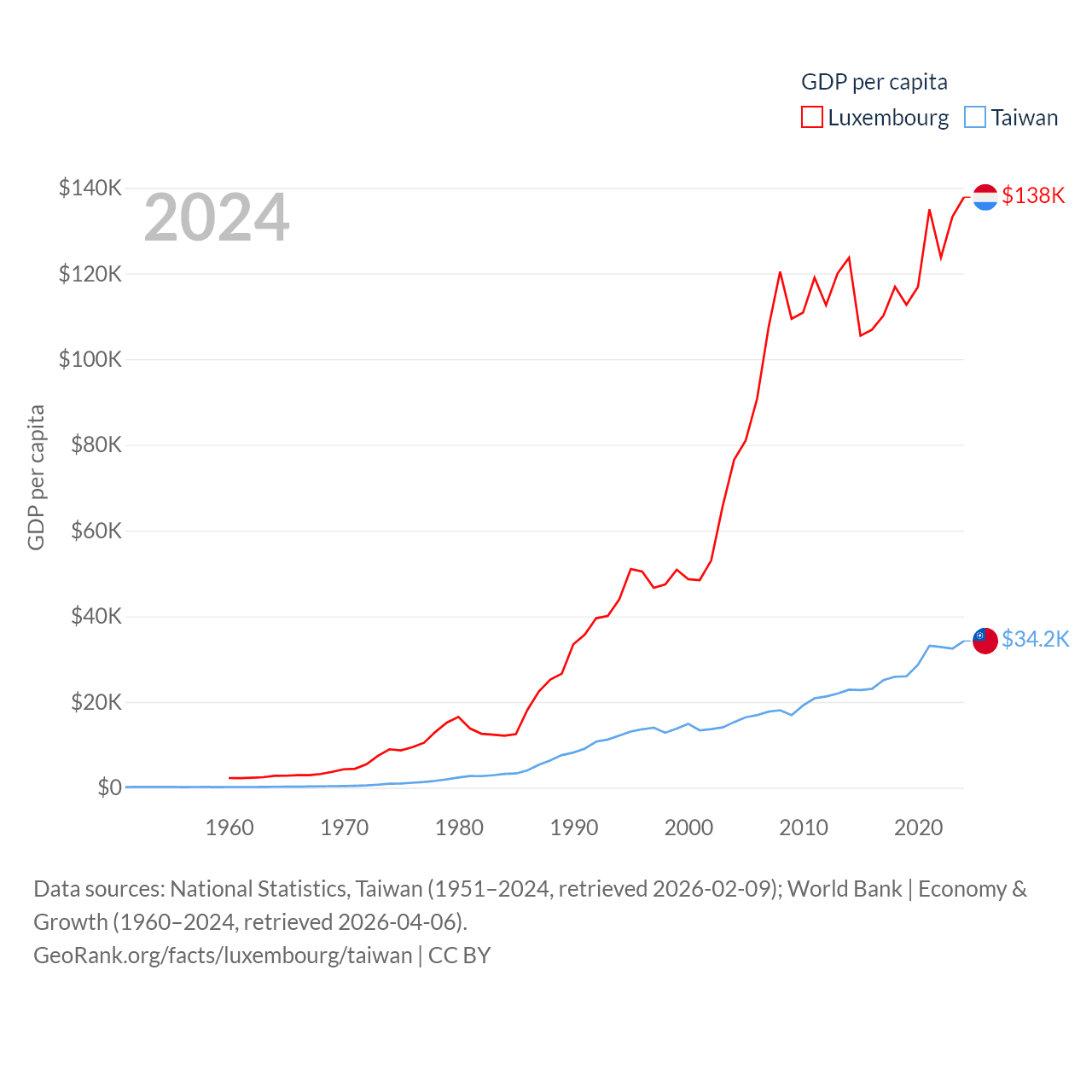 By GDP, Luxembourg ranks 74/197 ($93.3B) and Taiwan ranks 22/197 ($802B). By GDP per capita, Luxembourg ranks 3/197 ($137,782), while Taiwan ranks 35/197 ($34,238).