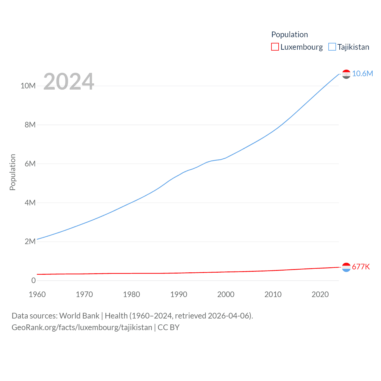 Luxembourg has a population of 677K (ranked 164/197), compared with 10.6M in Tajikistan (ranked 91/197). Luxembourg's land area is 994 sq mi versus 53,587 sq mi for Tajikistan (ranked 169th vs. 93rd).