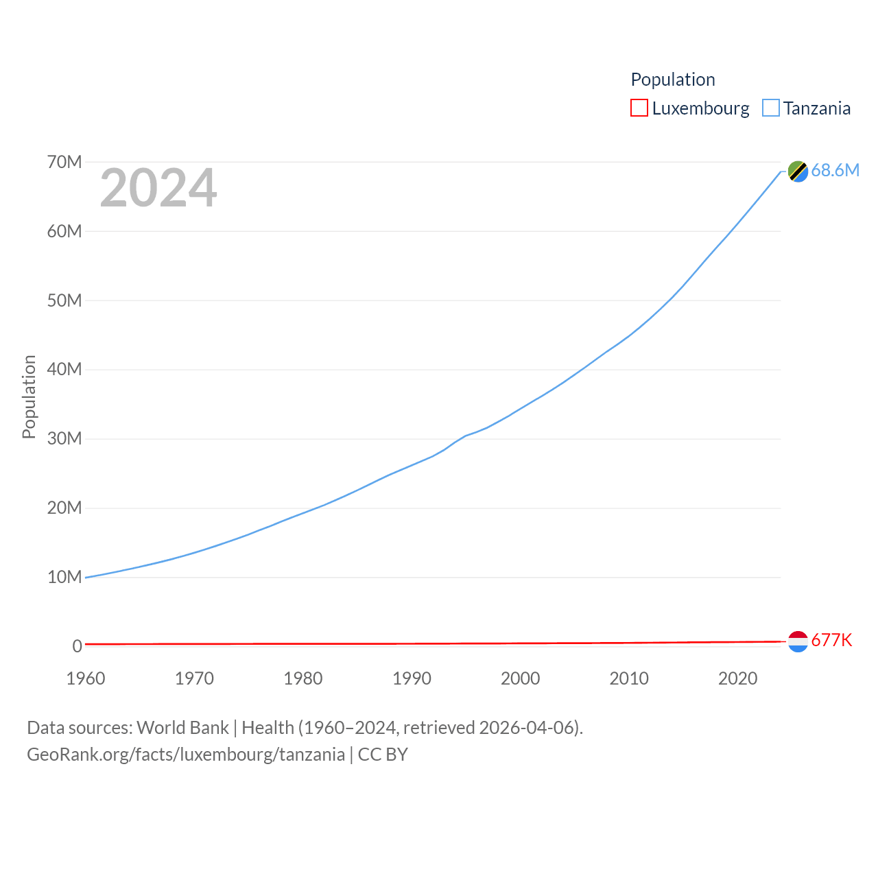 Luxembourg has a population of 677K (ranked 164/197), compared with 68.6M in Tanzania (ranked 22/197). Luxembourg's land area is 994 sq mi versus 342,009 sq mi for Tanzania (ranked 169th vs. 31st).