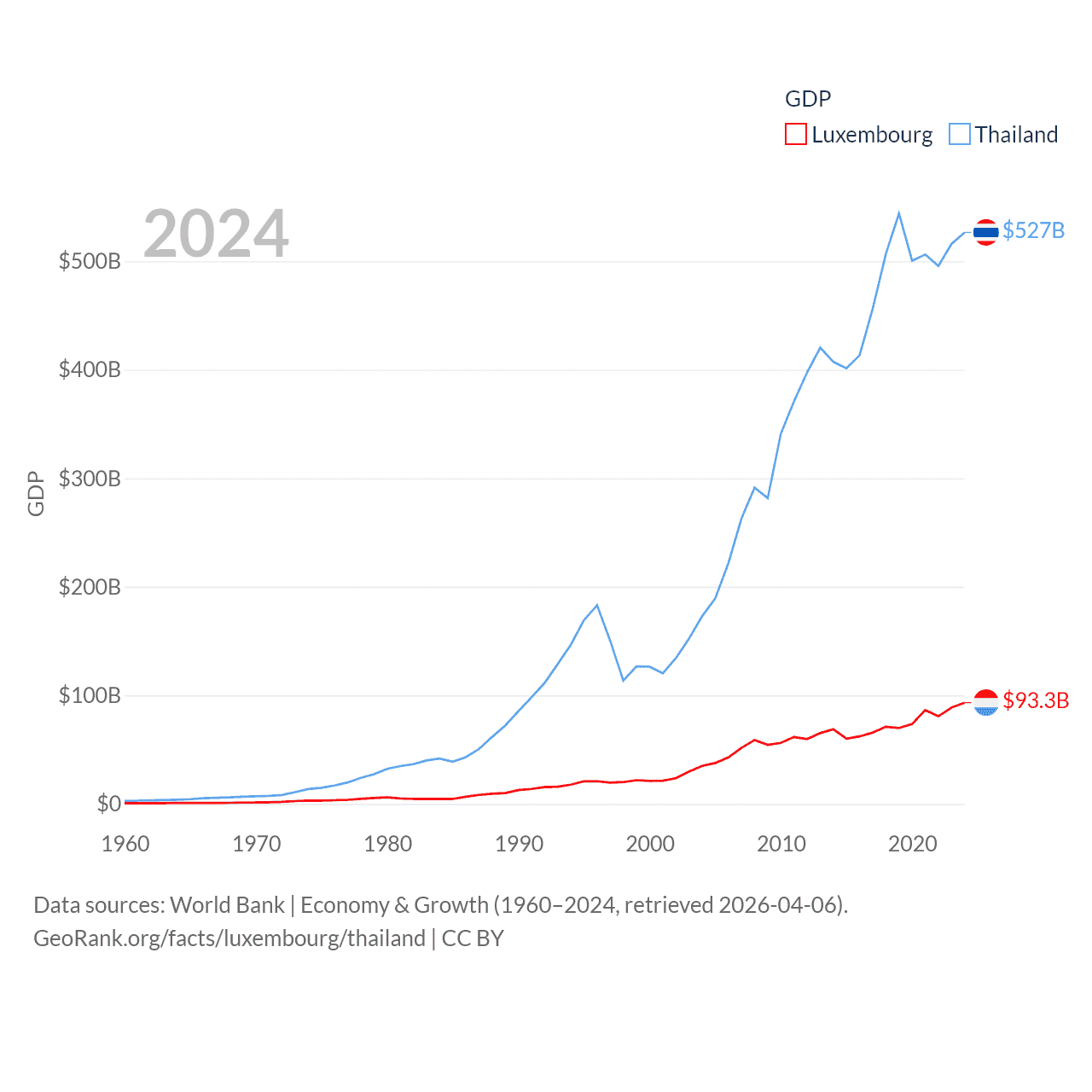 By GDP, Luxembourg ranks 74/197 ($93.3B) and Thailand ranks 31/197 ($527B). By GDP per capita, Luxembourg ranks 3/197 ($137,782), while Thailand ranks 100/197 ($7,347).