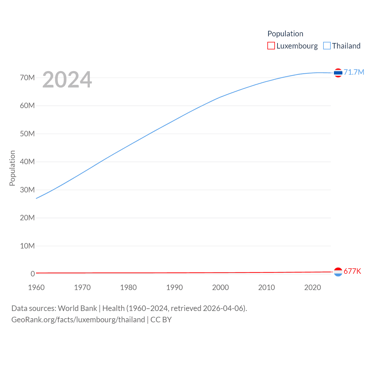 Luxembourg has a population of 677K (ranked 164/197), compared with 71.7M in Thailand (ranked 20/197). Luxembourg's land area is 994 sq mi versus 197,256 sq mi for Thailand (ranked 169th vs. 50th).