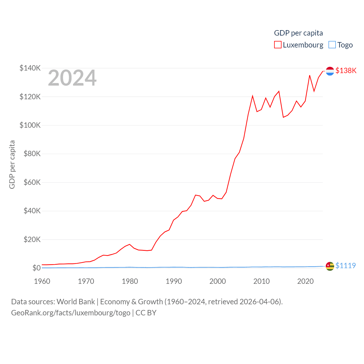 By GDP, Luxembourg ranks 74/197 ($93.3B) and Togo ranks 154/197 ($10.7B). By GDP per capita, Luxembourg ranks 3/197 ($137,782), while Togo ranks 172/197 ($1,119).