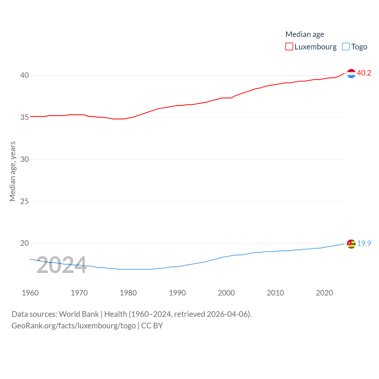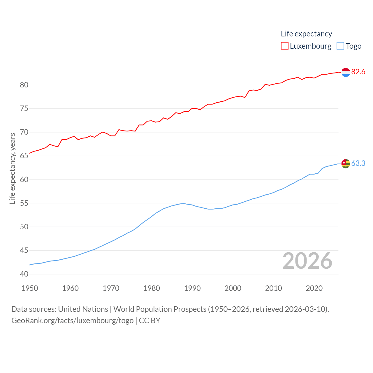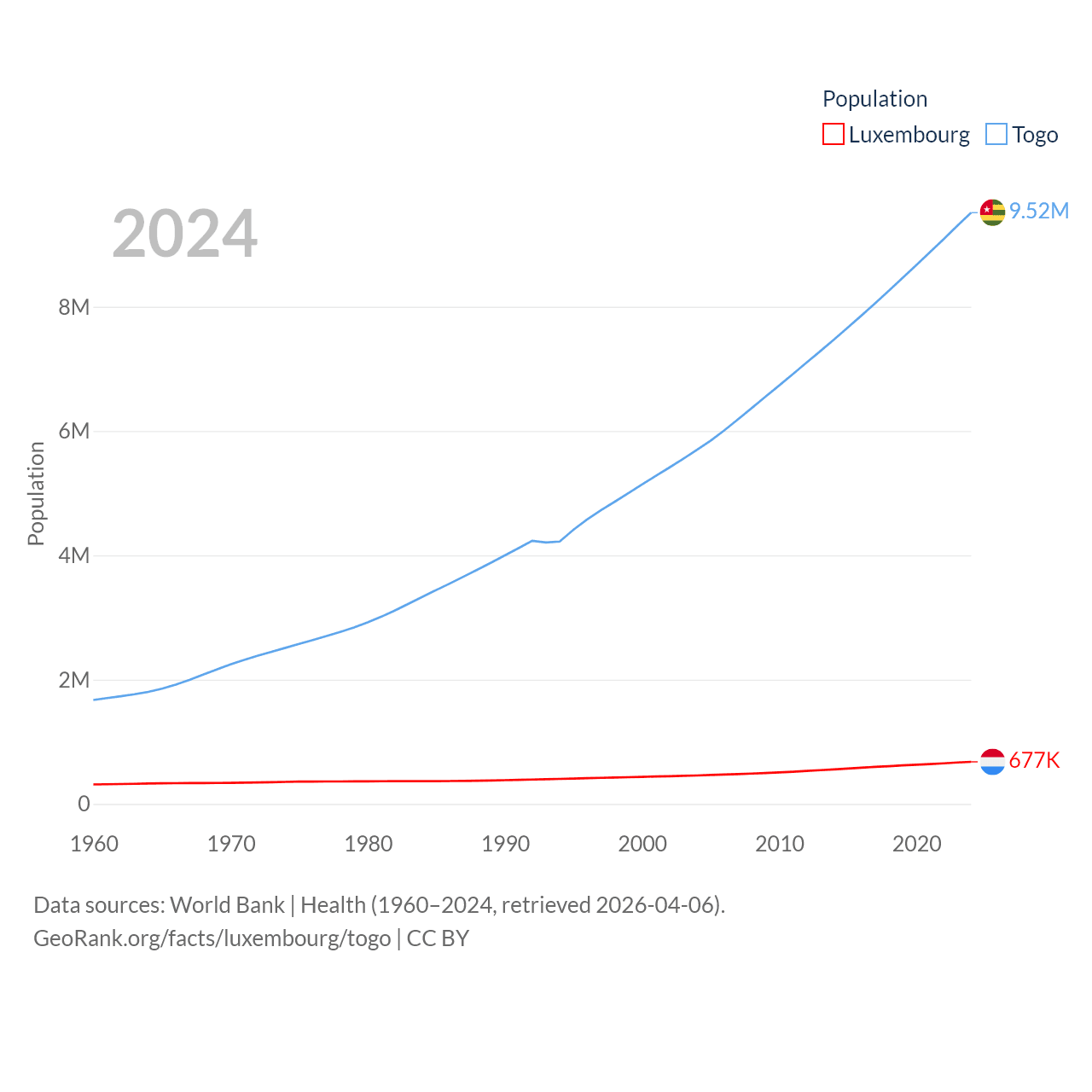 Luxembourg has a population of 677K (ranked 164/197), compared with 9.52M in Togo (ranked 98/197). Luxembourg's land area is 994 sq mi versus 21,000 sq mi for Togo (ranked 169th vs. 124th).