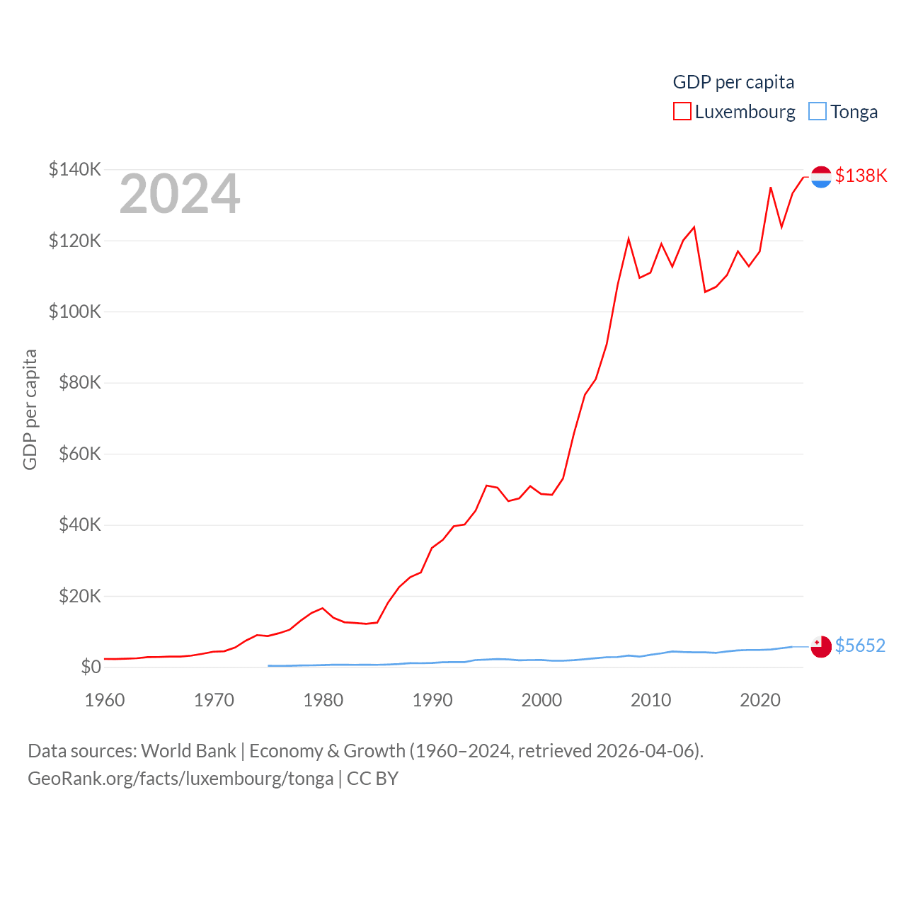 By GDP, Luxembourg ranks 74/197 ($93.3B) and Tonga ranks 191/197 ($591M). By GDP per capita, Luxembourg ranks 3/197 ($137,782), while Tonga ranks 115/197 ($5,652).