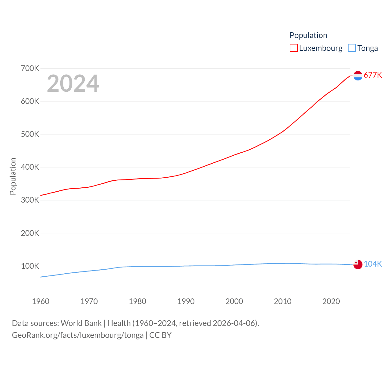 Luxembourg has a population of 677K (ranked 164/197), compared with 104K in Tonga (ranked 183/197). Luxembourg's land area is 994 sq mi versus 278 sq mi for Tonga (ranked 169th vs. 176th).