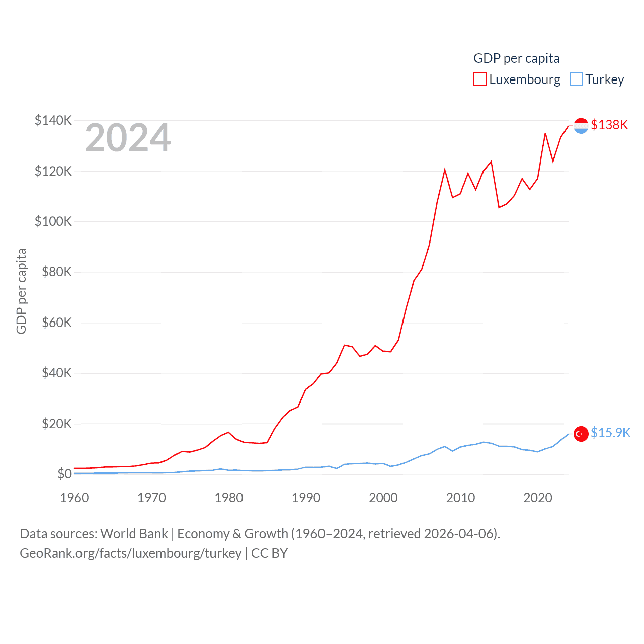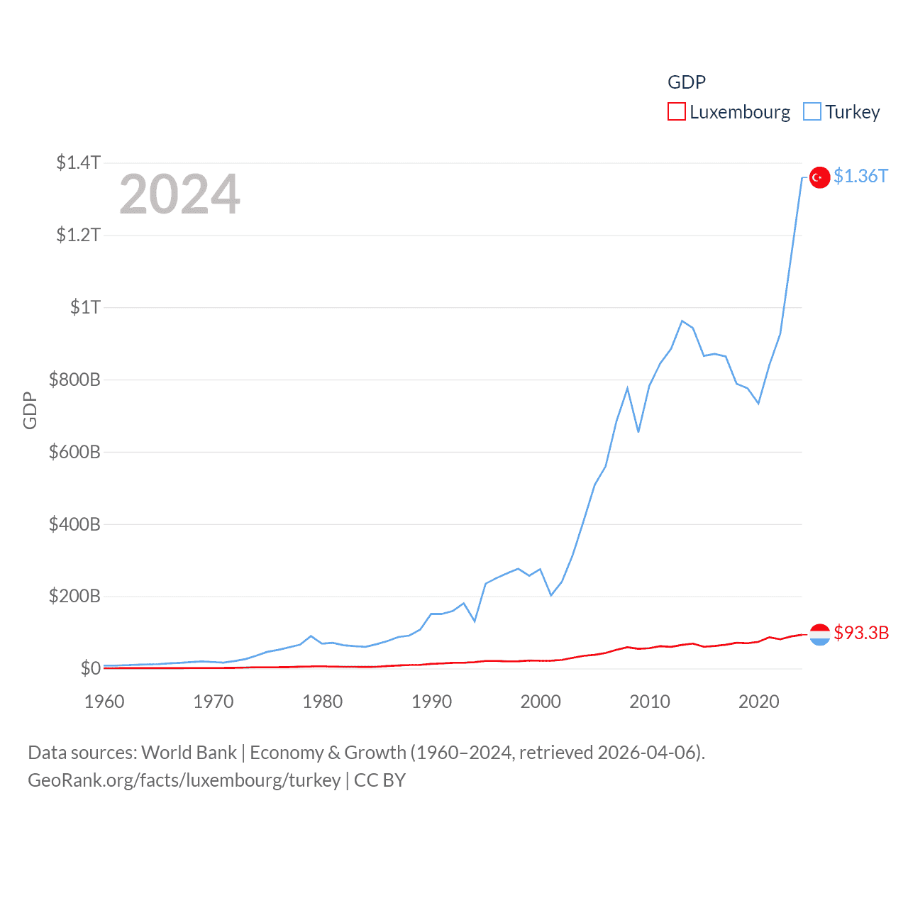 By GDP, Luxembourg ranks 74/197 ($93.3B) and Turkey ranks 17/197 ($1.36T). By GDP per capita, Luxembourg ranks 3/197 ($137,782), while Turkey ranks 66/197 ($15,893).