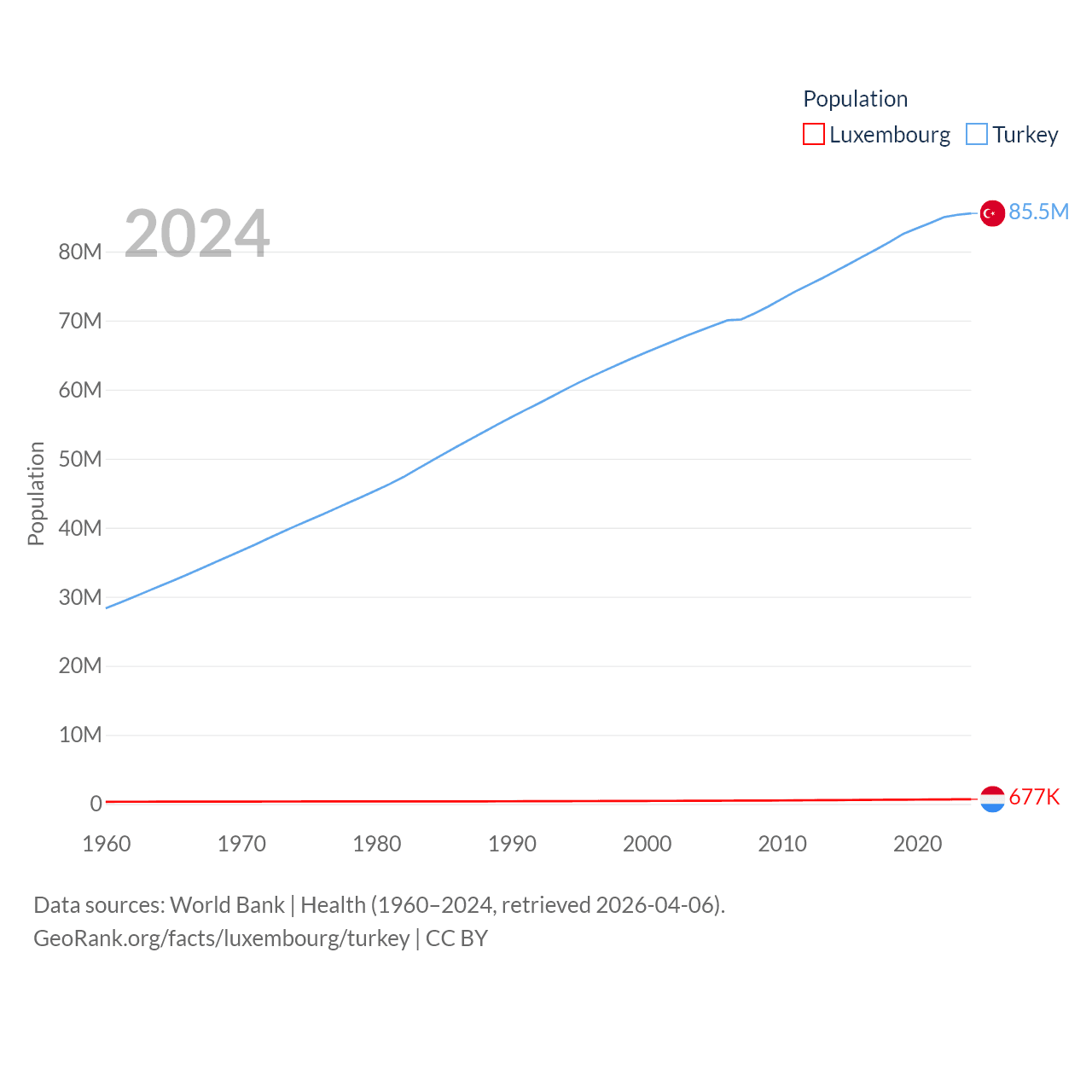 Luxembourg has a population of 677K (ranked 164/197), compared with 85.5M in Turkey (ranked 18/197). Luxembourg's land area is 994 sq mi versus 297,156 sq mi for Turkey (ranked 169th vs. 36th).