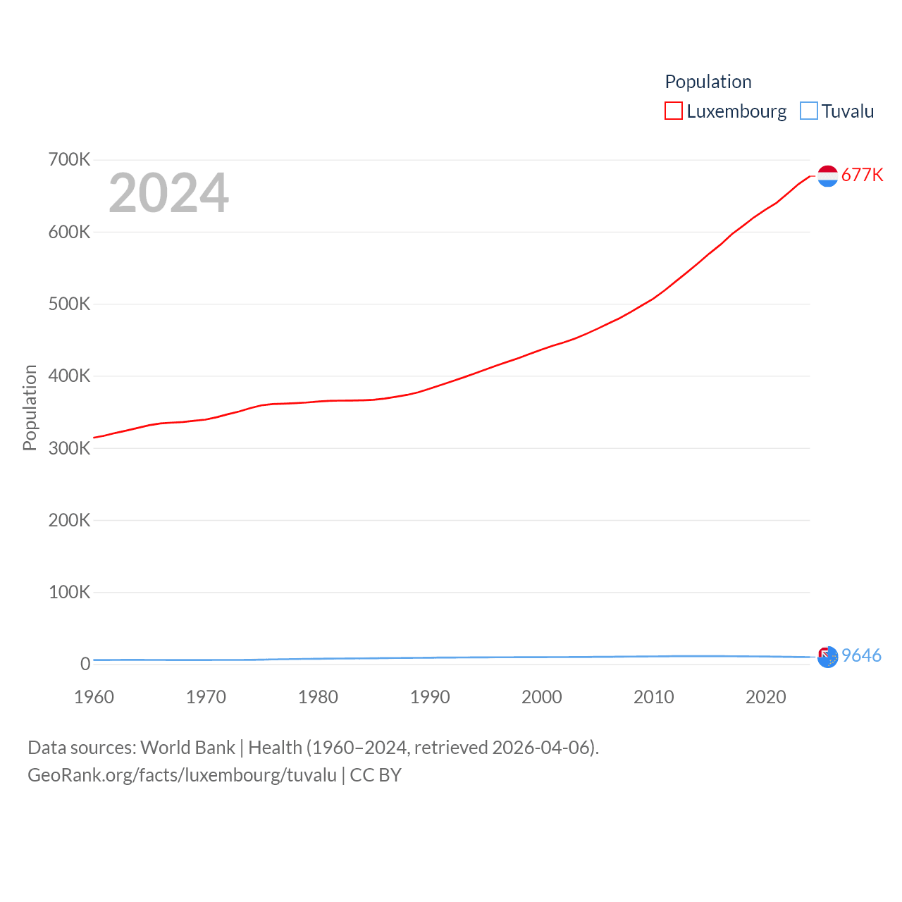 Luxembourg has a population of 677K (ranked 164/197), compared with 9.65K in Tuvalu (ranked 196/197). Luxembourg's land area is 994 sq mi versus 11.6 sq mi for Tuvalu (ranked 169th vs. 194th).
