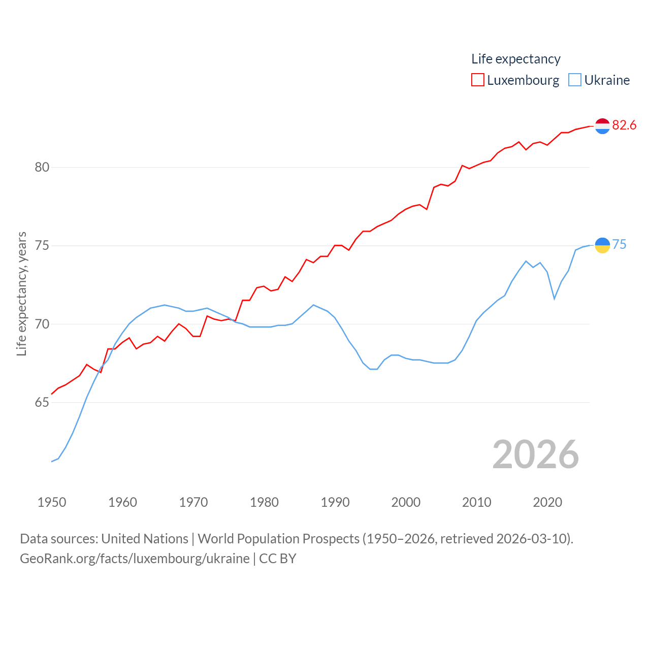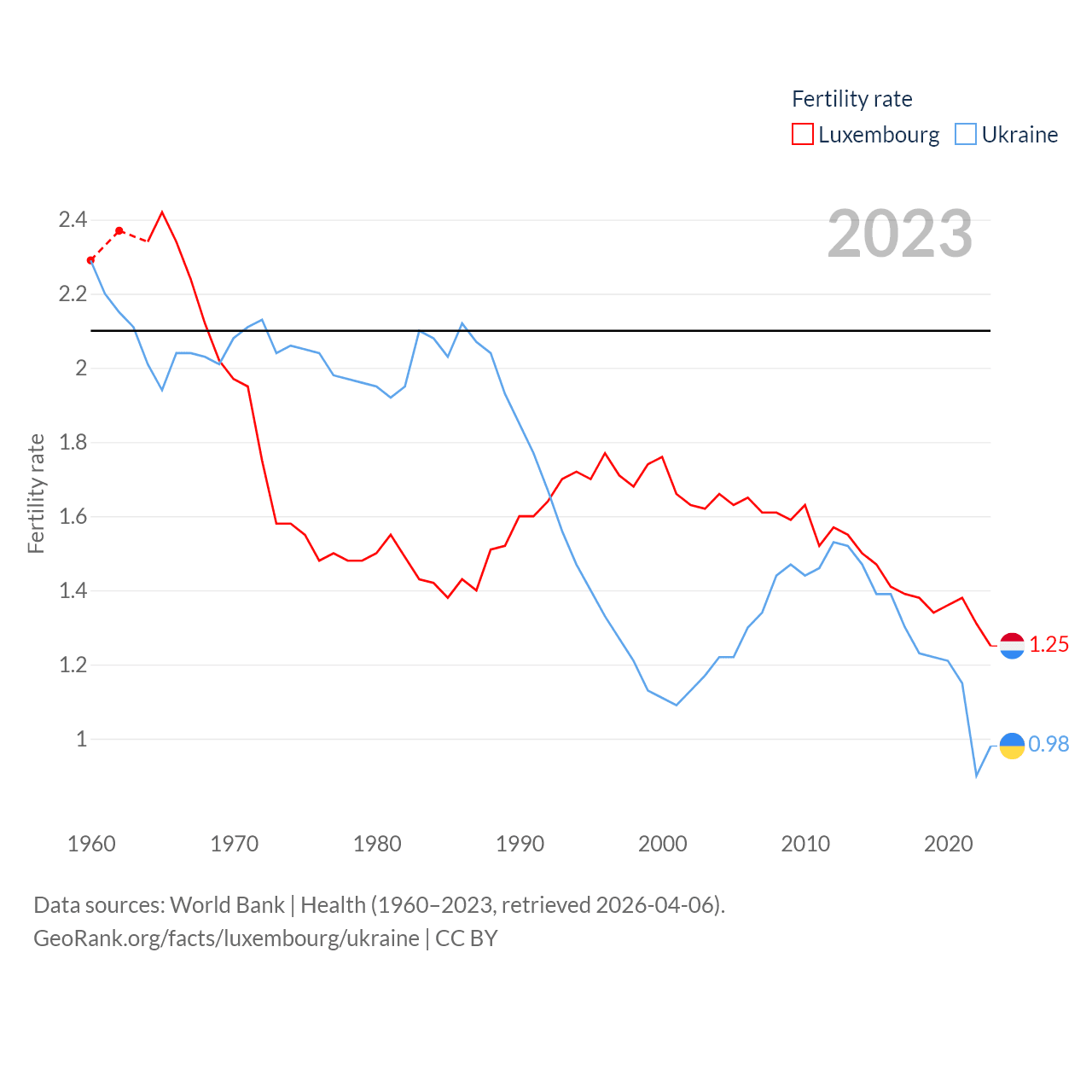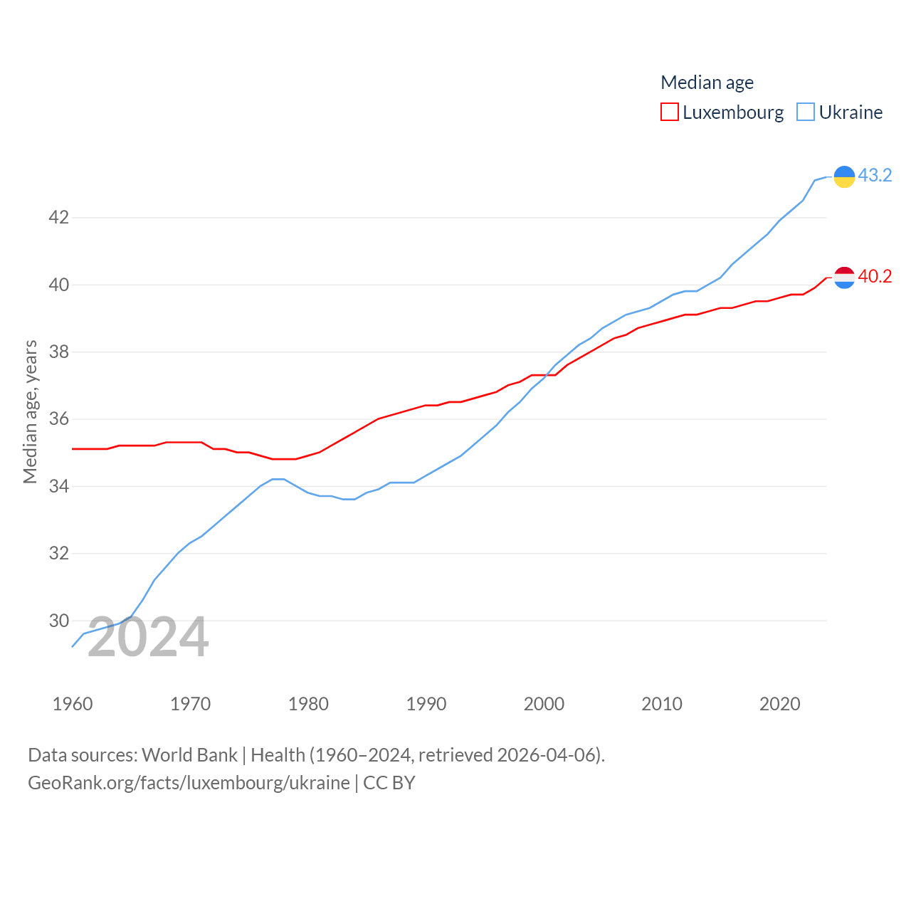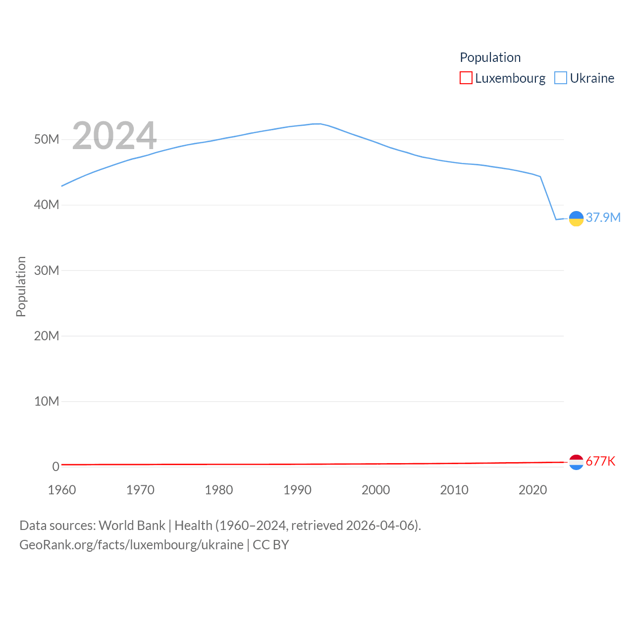 Luxembourg has a population of 677K (ranked 164/197), compared with 37.9M in Ukraine (ranked 41/197). Luxembourg's land area is 994 sq mi versus 223,708 sq mi for Ukraine (ranked 169th vs. 46th).