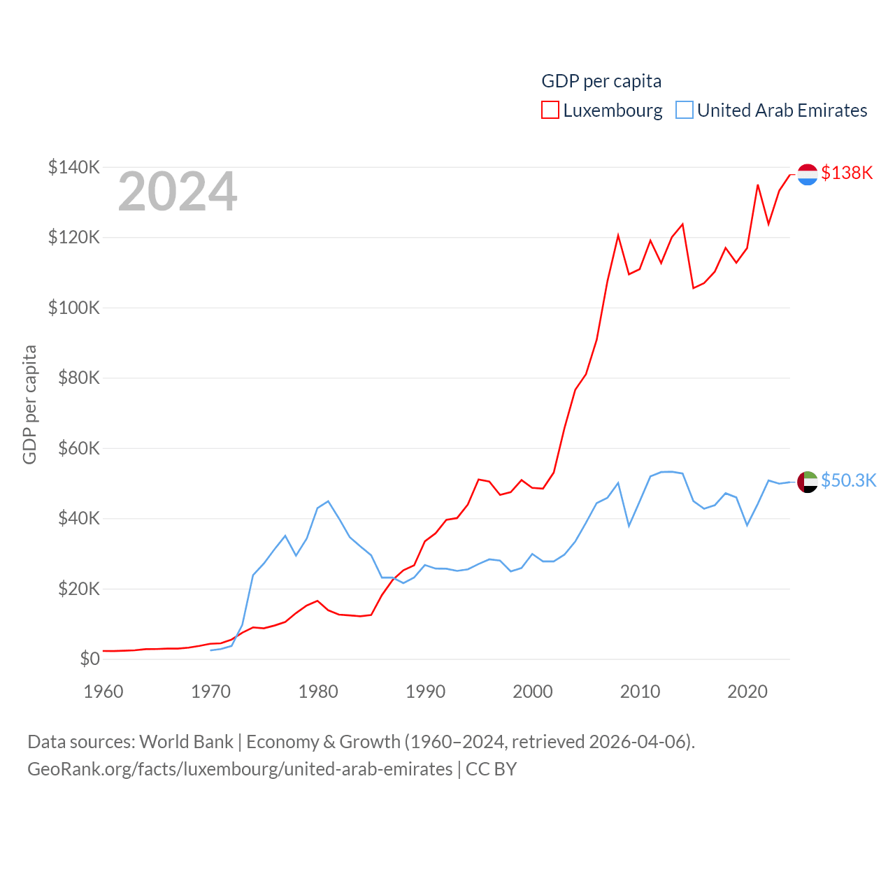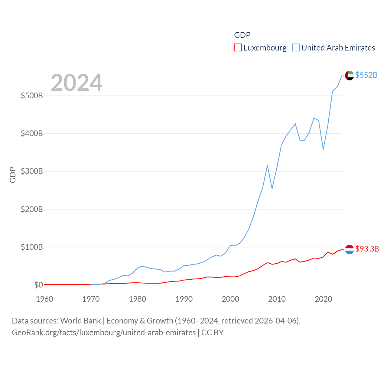 By GDP, Luxembourg ranks 74/197 ($93.3B) and The United Arab Emirates ranks 27/197 ($552B). By GDP per capita, Luxembourg ranks 3/197 ($137,782), while The United Arab Emirates ranks 24/197 ($50,274).