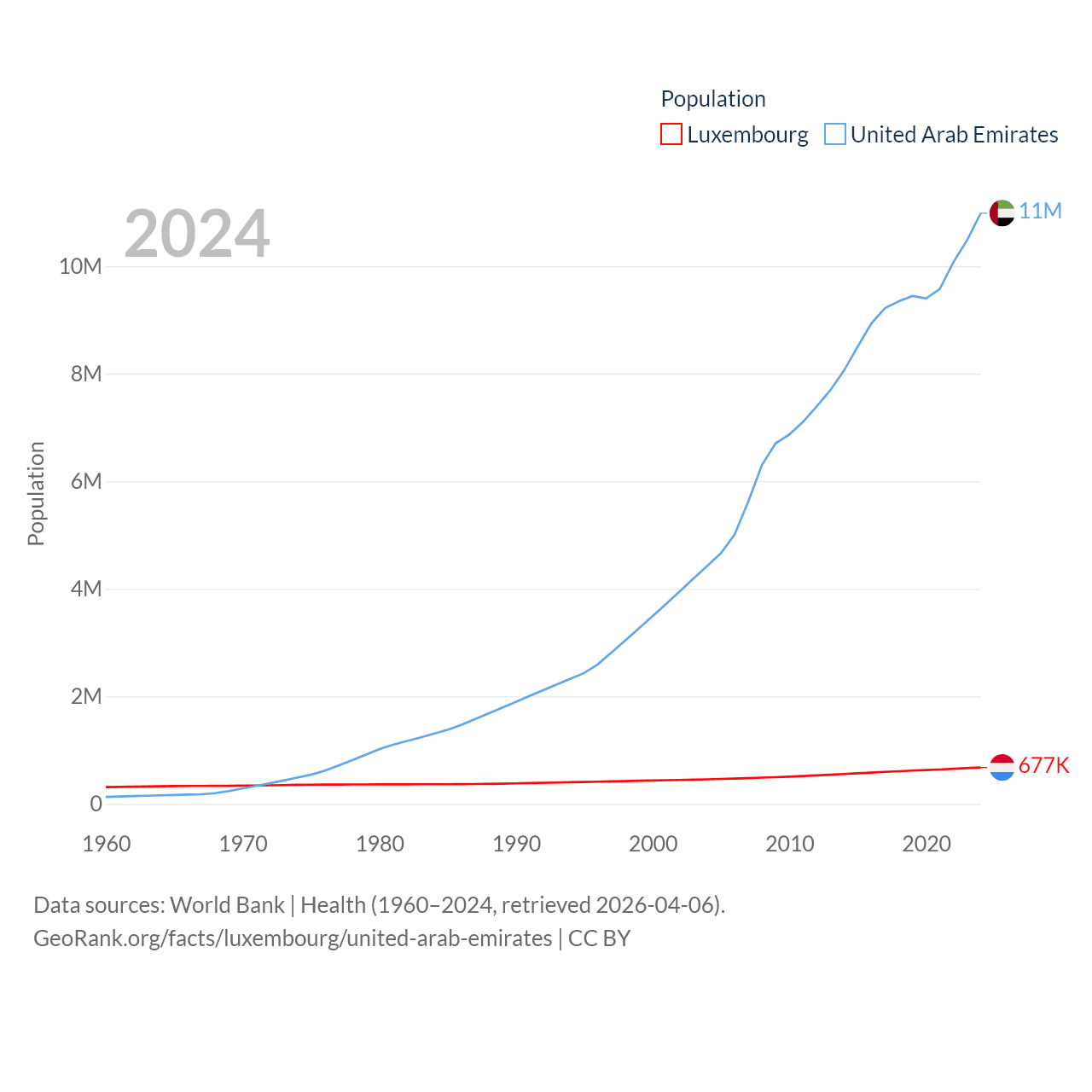 Luxembourg has a population of 677K (ranked 164/197), compared with 11M in The United Arab Emirates (ranked 86/197). Luxembourg's land area is 994 sq mi versus 27,421 sq mi for The United Arab Emirates (ranked 169th vs. 117th).