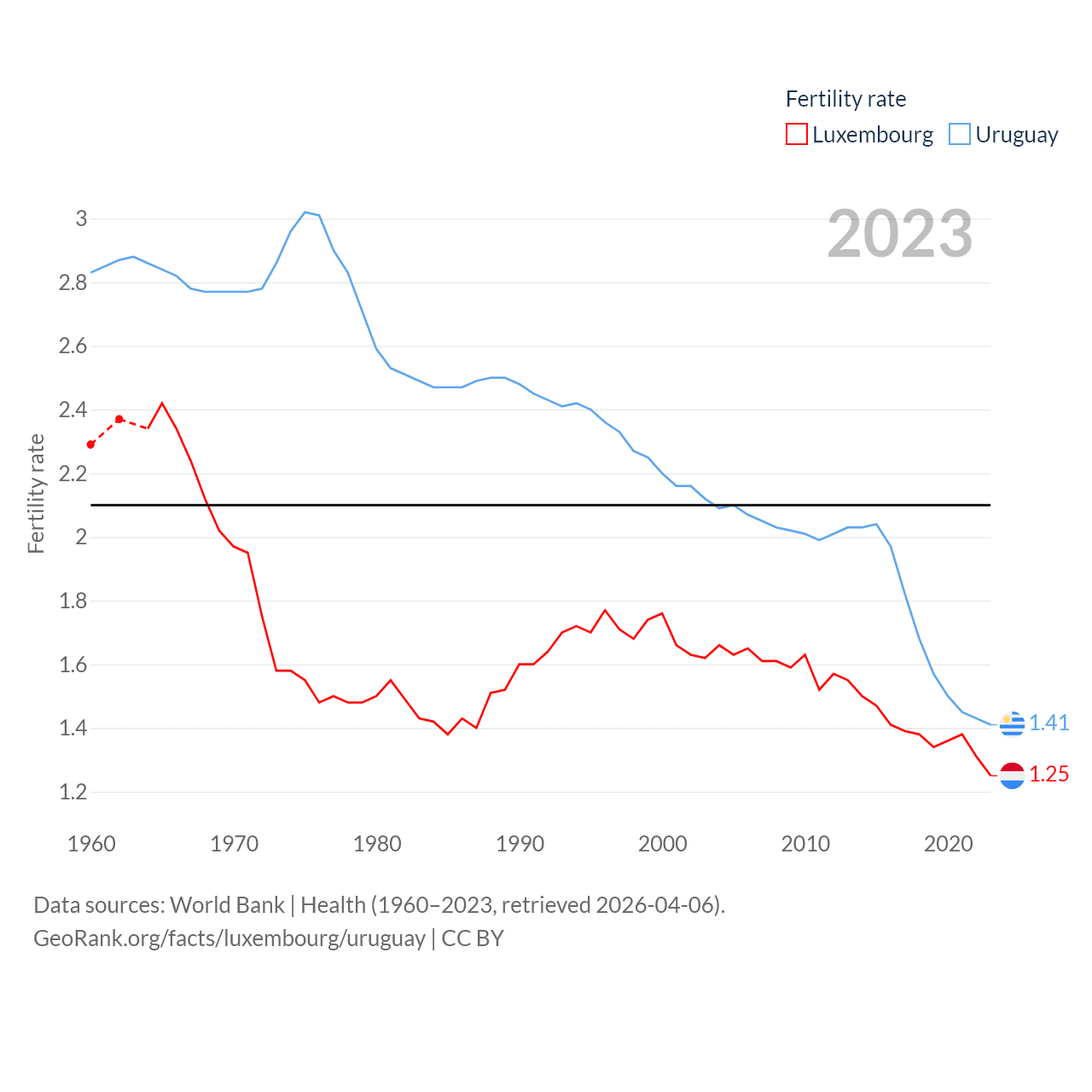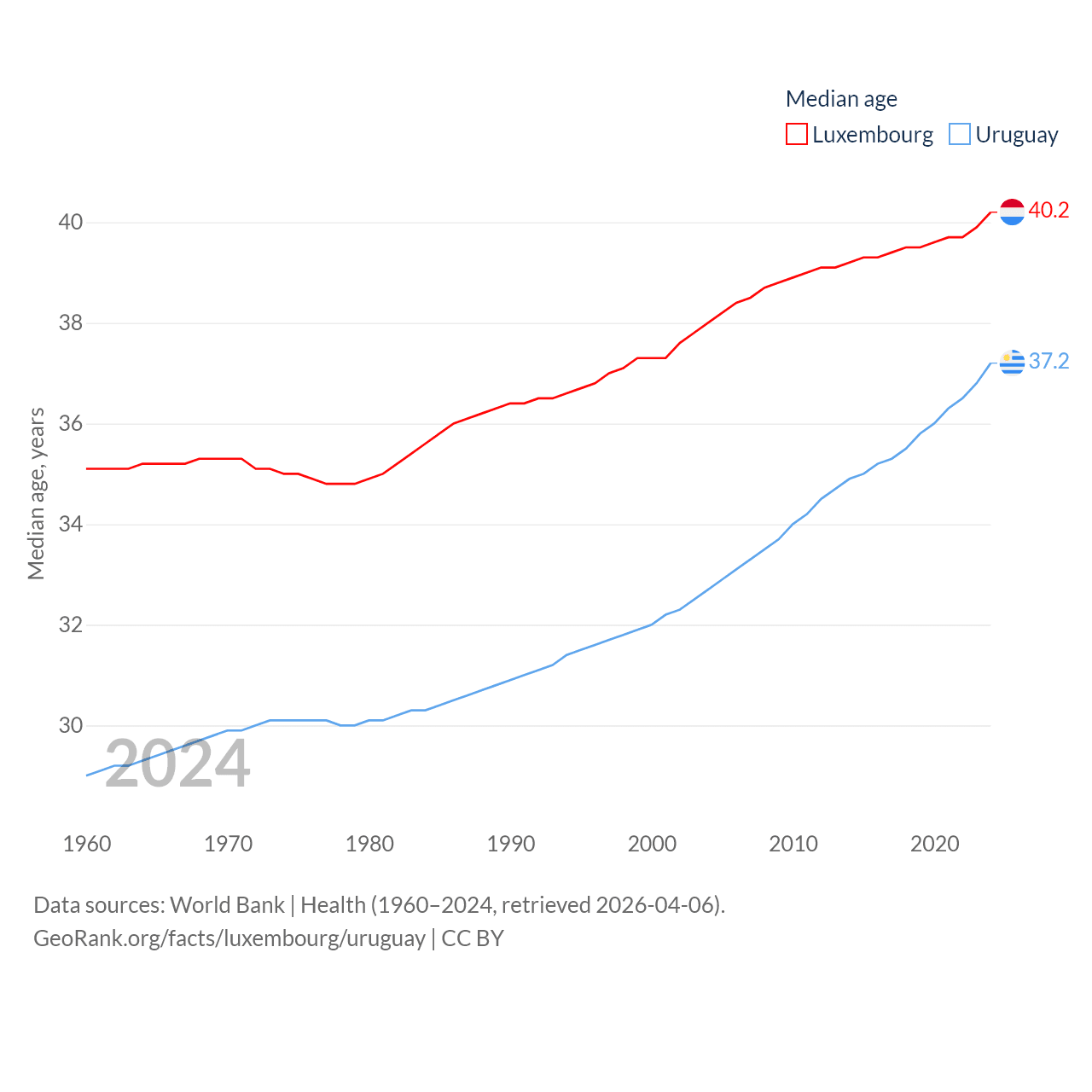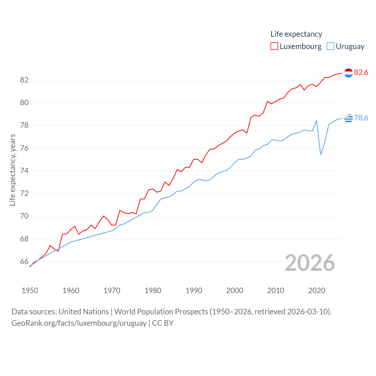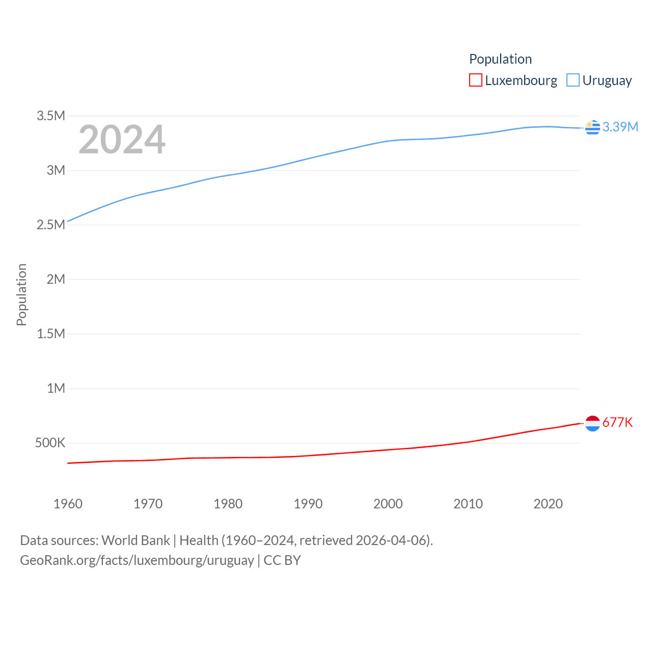 Luxembourg has a population of 677K (ranked 164/197), compared with 3.39M in Uruguay (ranked 133/197). Luxembourg's land area is 994 sq mi versus 67,576 sq mi for Uruguay (ranked 169th vs. 89th).