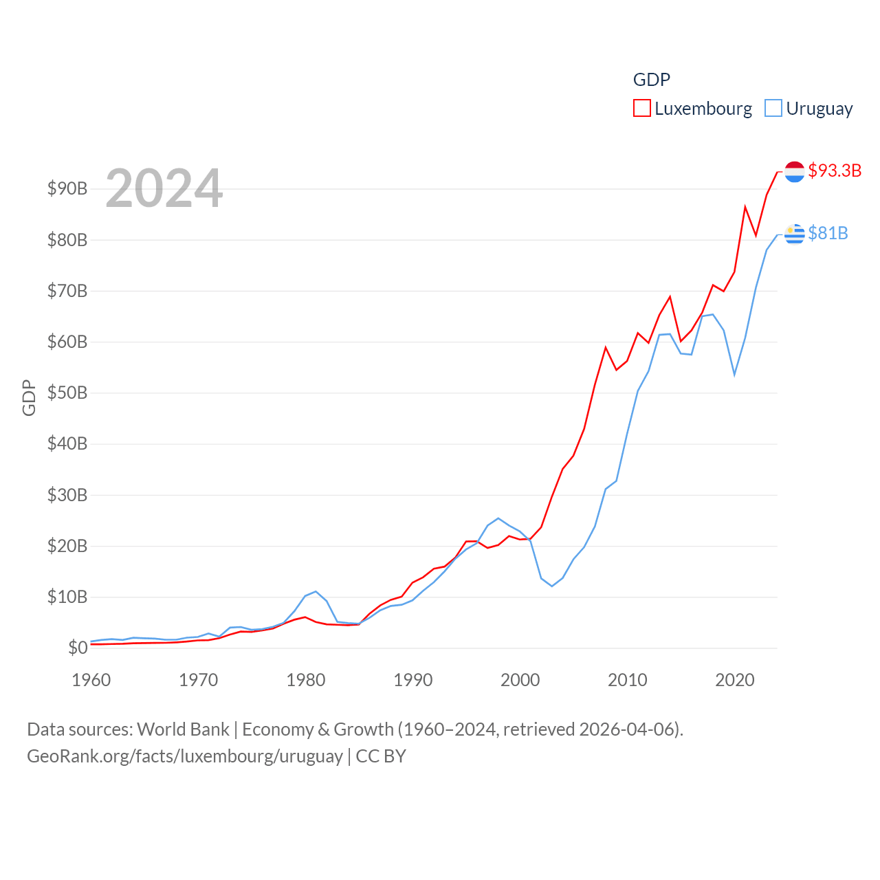 By GDP, Luxembourg ranks 74/197 ($93.3B) and Uruguay ranks 81/197 ($81B). By GDP per capita, Luxembourg ranks 3/197 ($137,782), while Uruguay ranks 52/197 ($23,907).