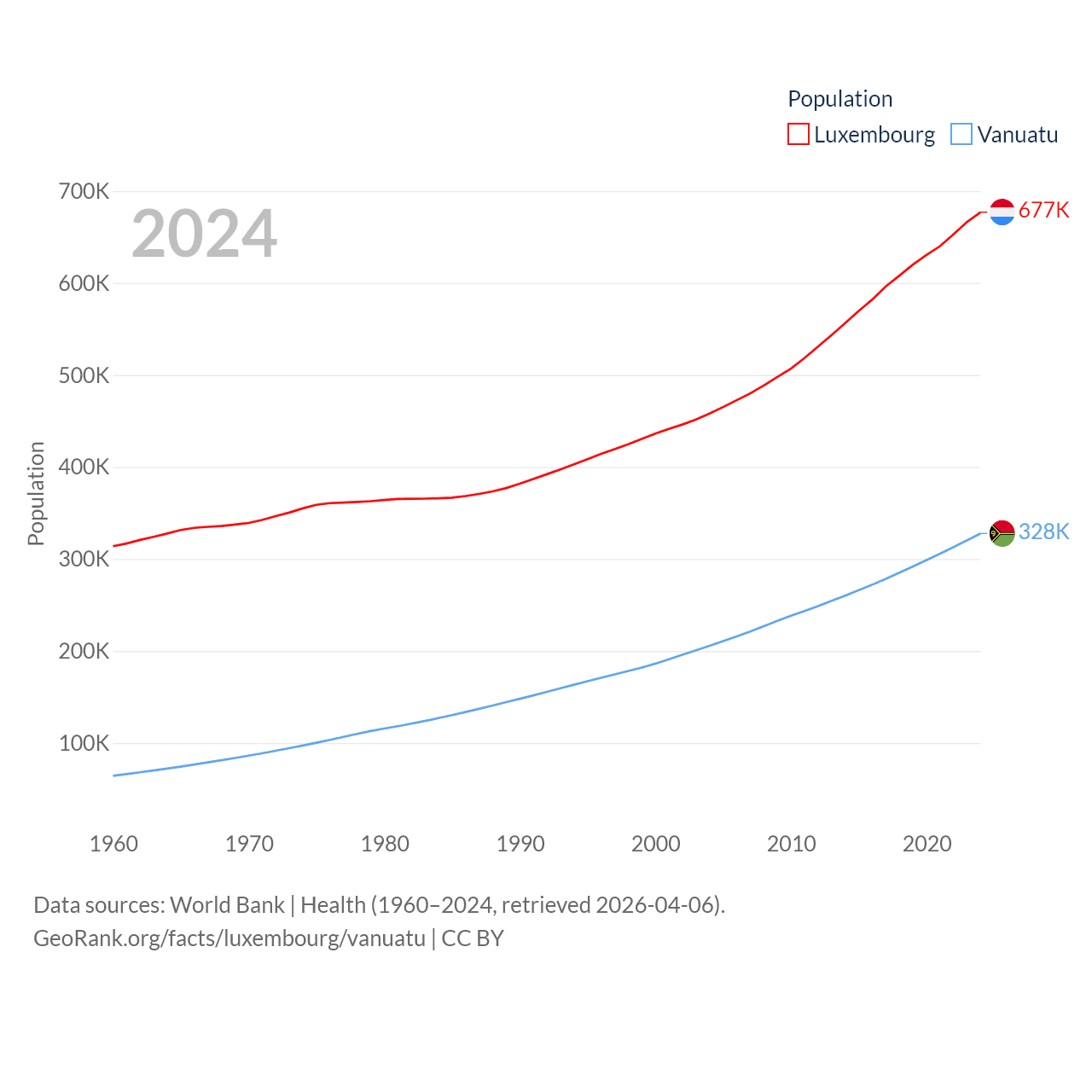 Luxembourg has a population of 677K (ranked 164/197), compared with 328K in Vanuatu (ranked 174/197). Luxembourg's land area is 994 sq mi versus 4,707 sq mi for Vanuatu (ranked 169th vs. 157th).