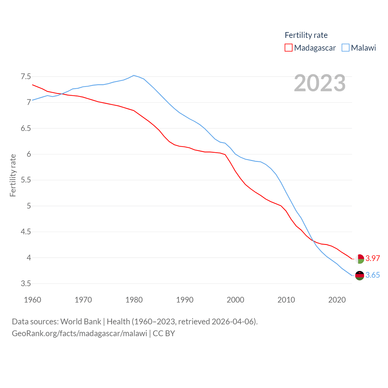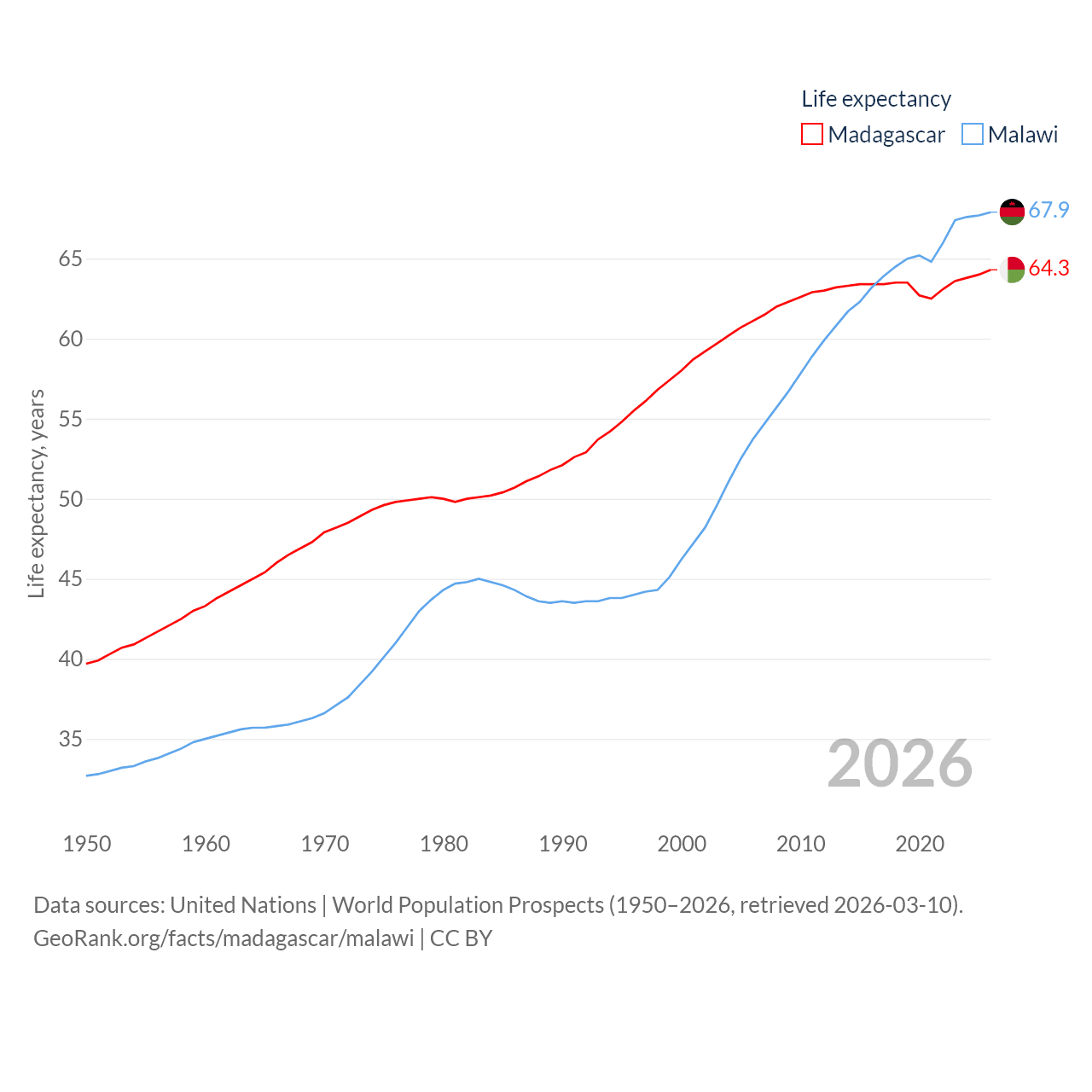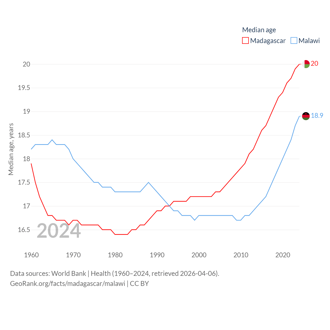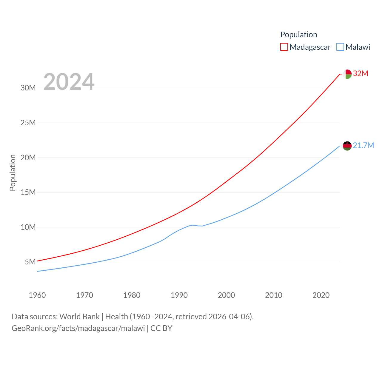 Madagascar has a population of 32M (ranked 49/197), compared with 21.7M in Malawi (ranked 62/197). Madagascar's land area is 224,634 sq mi versus 36,402 sq mi for Malawi (ranked 44th vs. 107th).