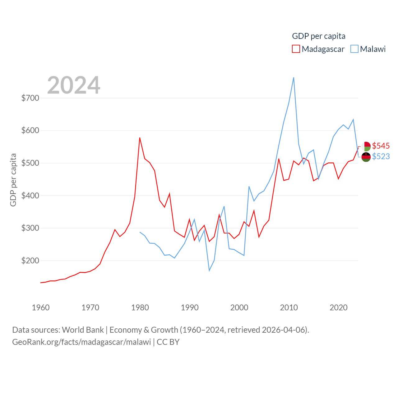By GDP, Madagascar ranks 136/197 ($17.4B) and Malawi ranks 151/197 ($11.3B). By GDP per capita, Madagascar ranks 193/197 ($545), while Malawi ranks 194/197 ($523).
