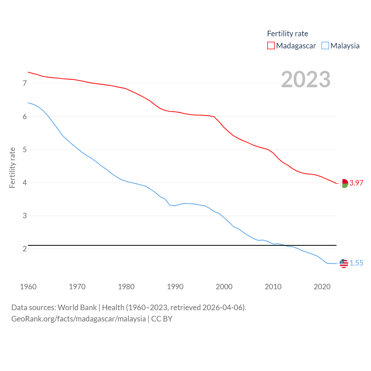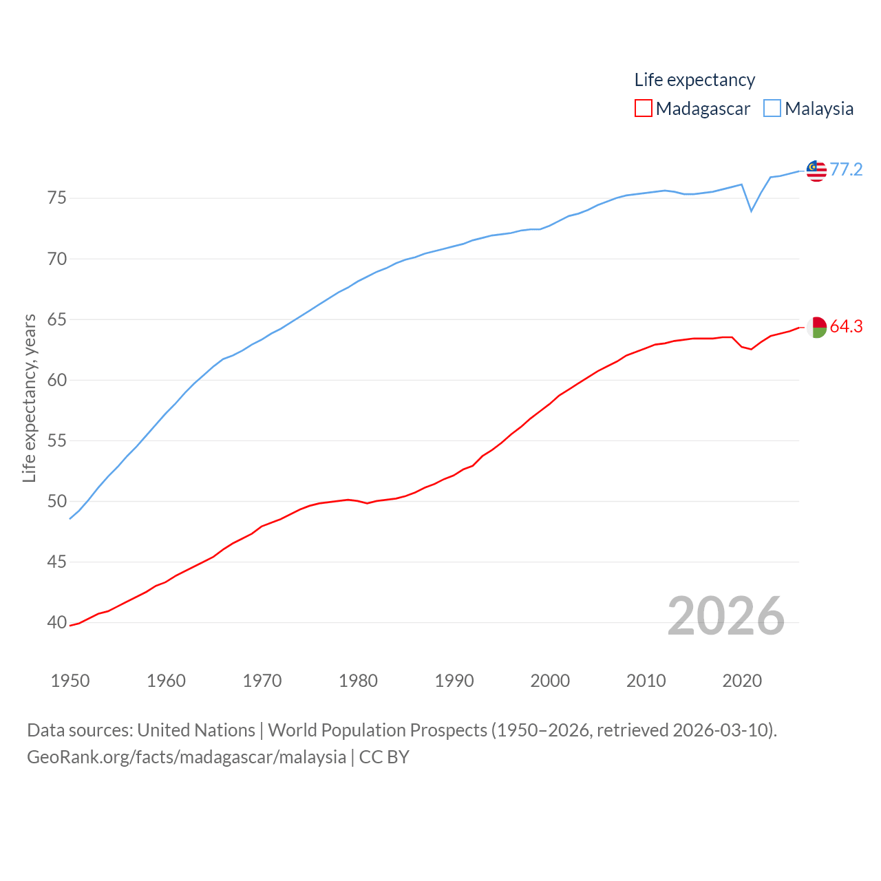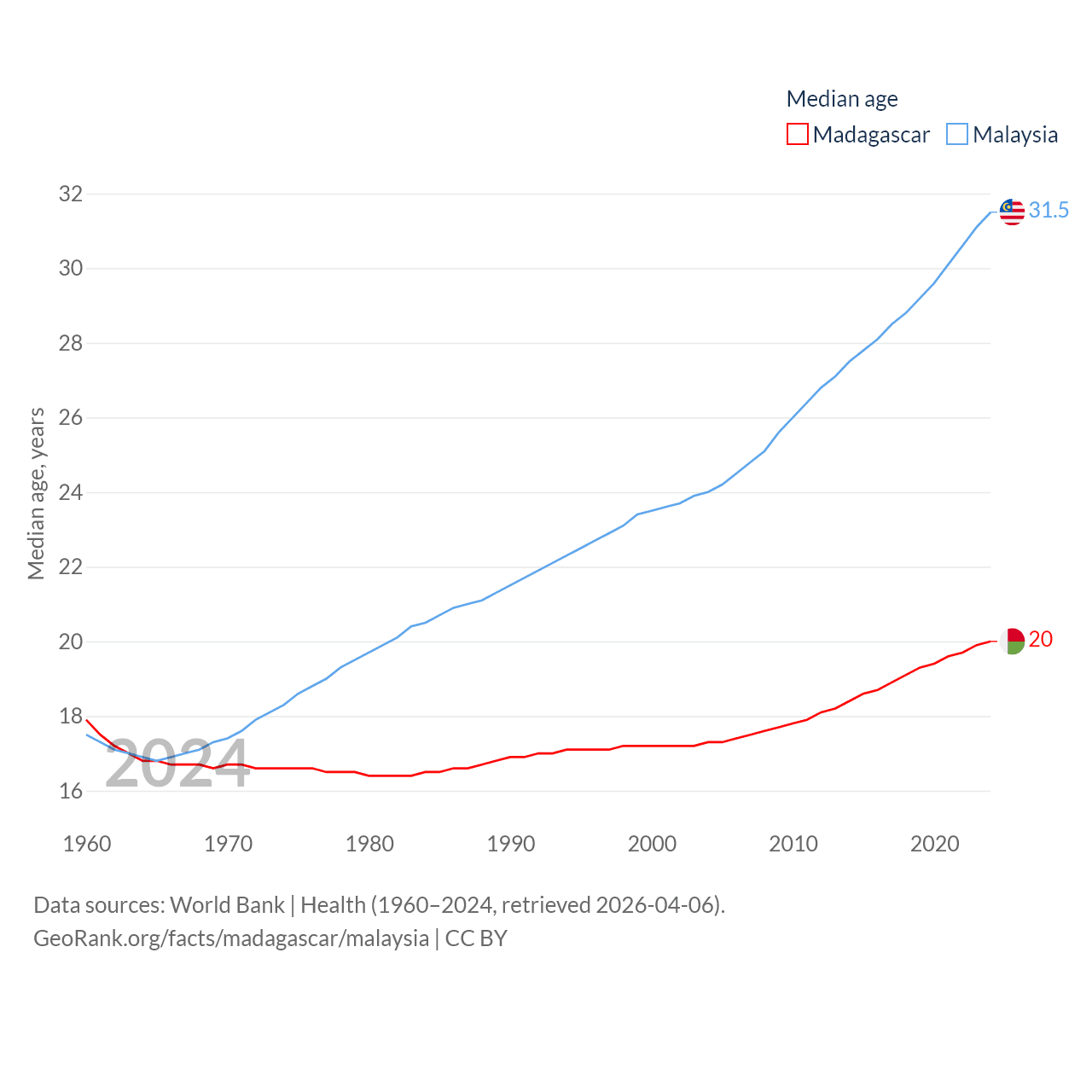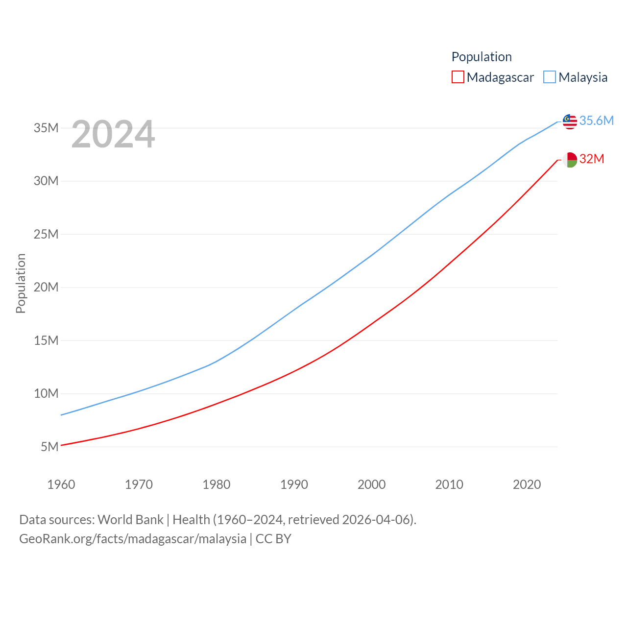 Madagascar has a population of 32M (ranked 49/197), compared with 35.6M in Malaysia (ranked 44/197). Madagascar's land area is 224,634 sq mi versus 126,854 sq mi for Malaysia (ranked 44th vs. 65th).
