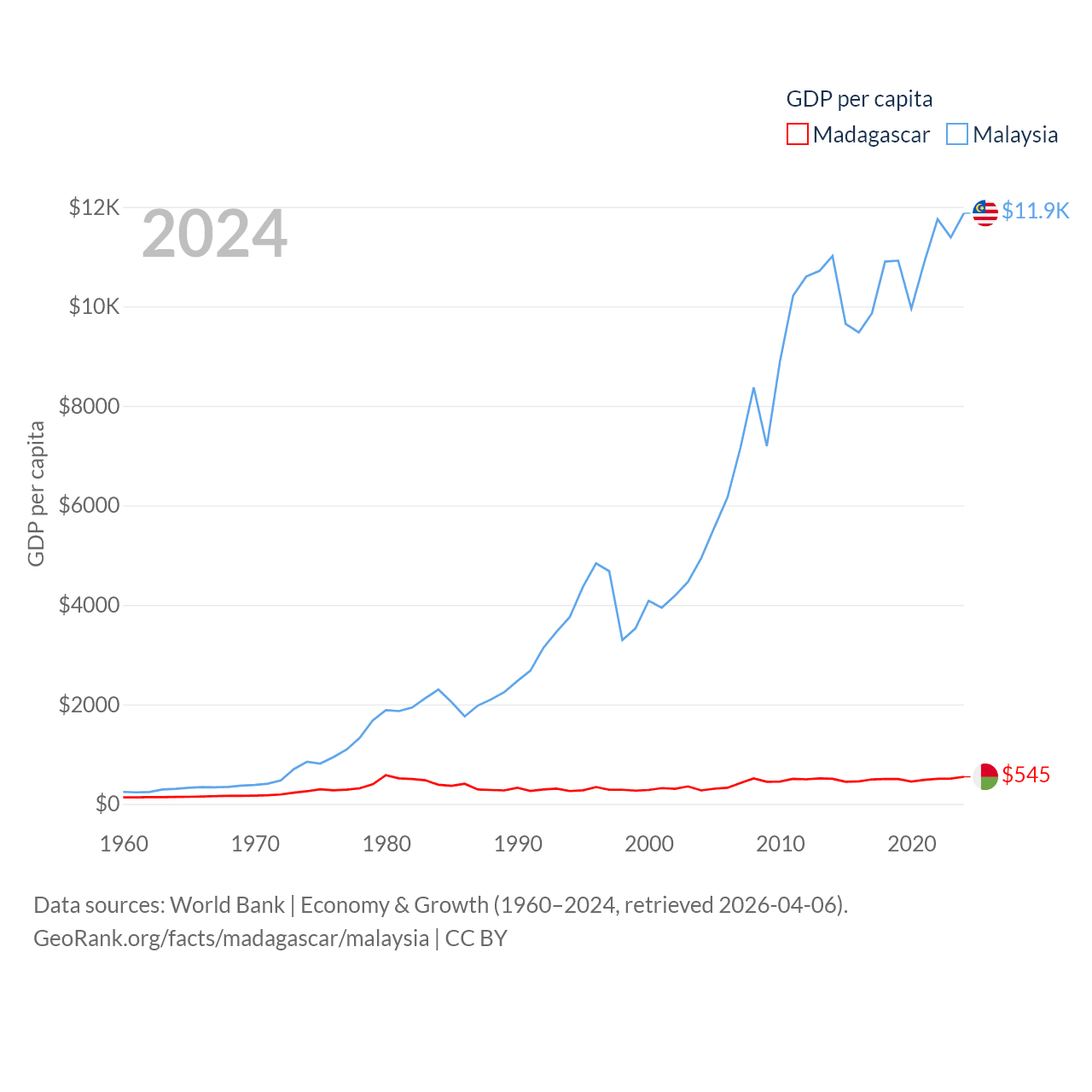 By GDP, Madagascar ranks 136/197 ($17.4B) and Malaysia ranks 38/197 ($422B). By GDP per capita, Madagascar ranks 193/197 ($545), while Malaysia ranks 79/197 ($11,874).