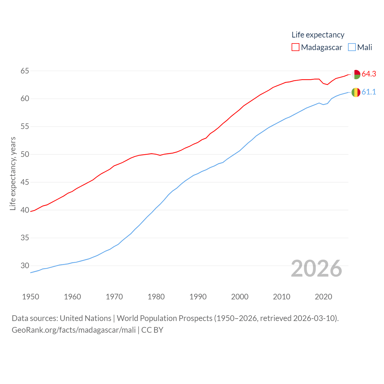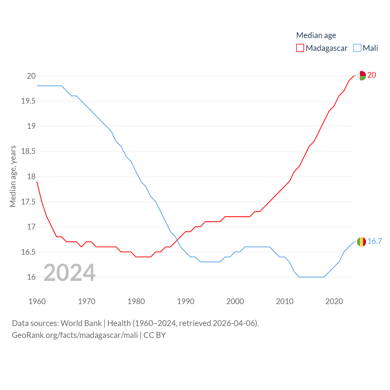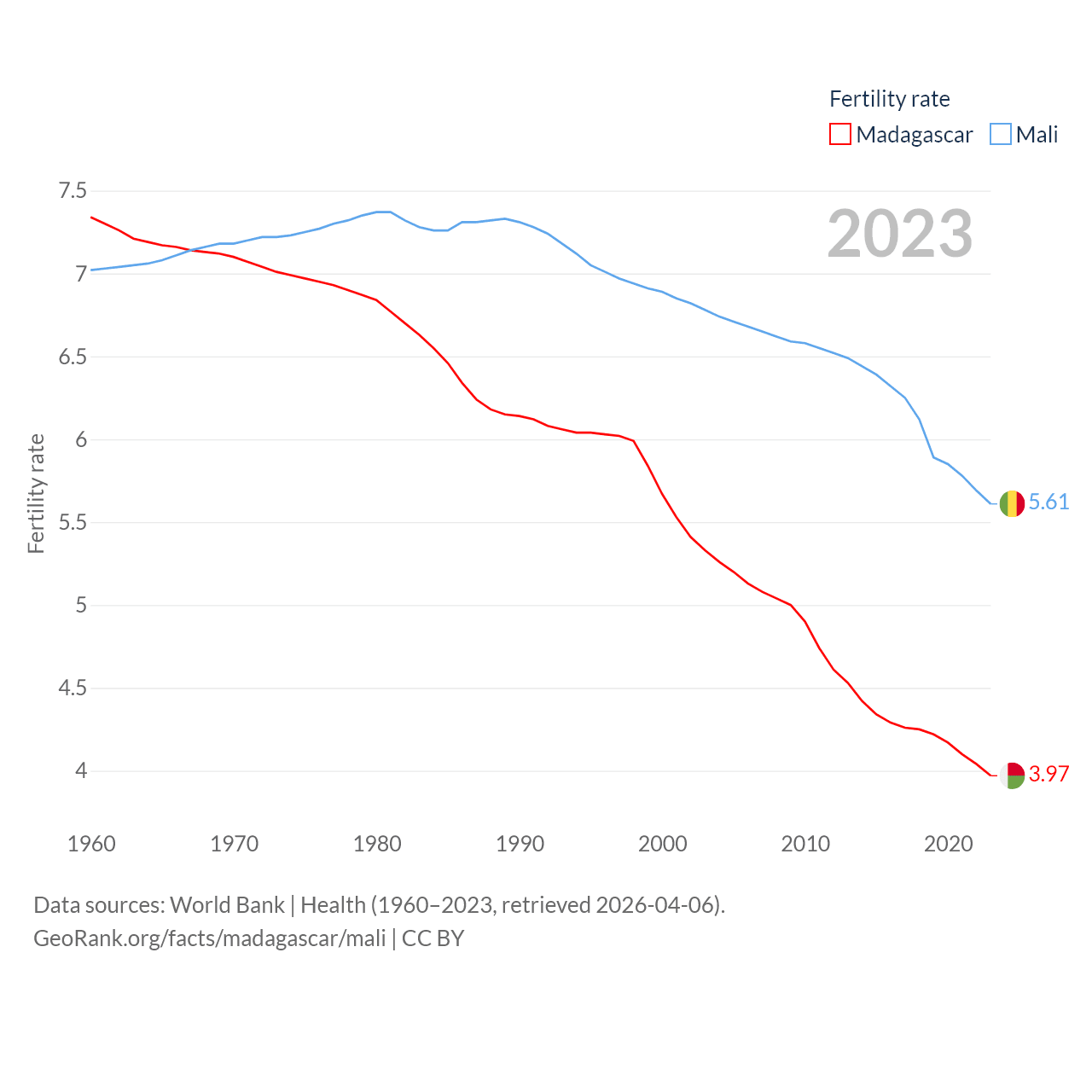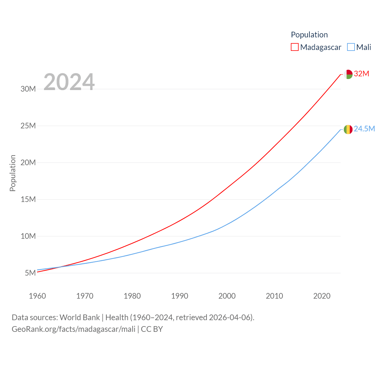 Madagascar has a population of 32M (ranked 49/197), compared with 24.5M in Mali (ranked 58/197). Madagascar's land area is 224,634 sq mi versus 471,118 sq mi for Mali (ranked 44th vs. 23rd).