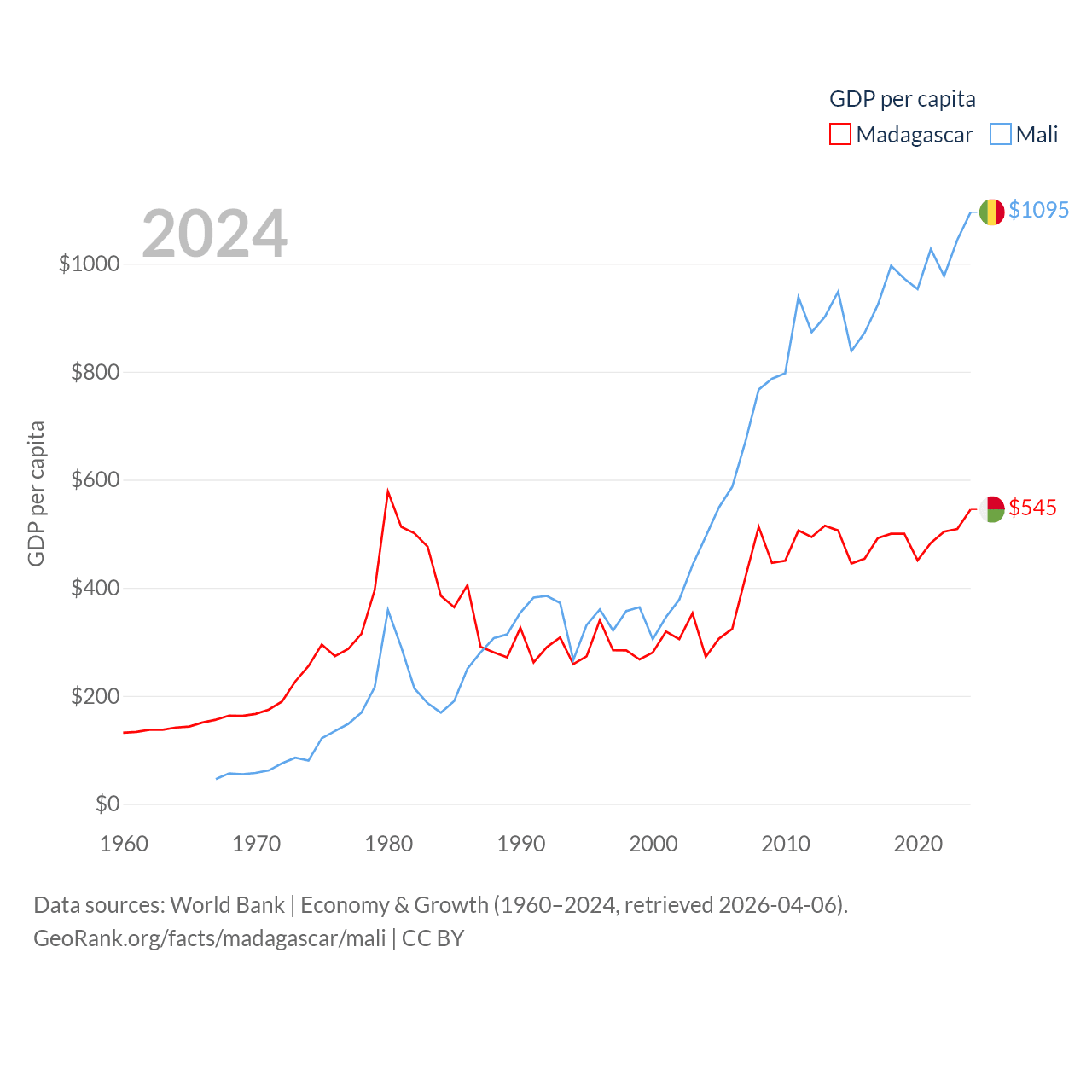 By GDP, Madagascar ranks 136/197 ($17.4B) and Mali ranks 113/197 ($26.8B). By GDP per capita, Madagascar ranks 193/197 ($545), while Mali ranks 173/197 ($1,095).
