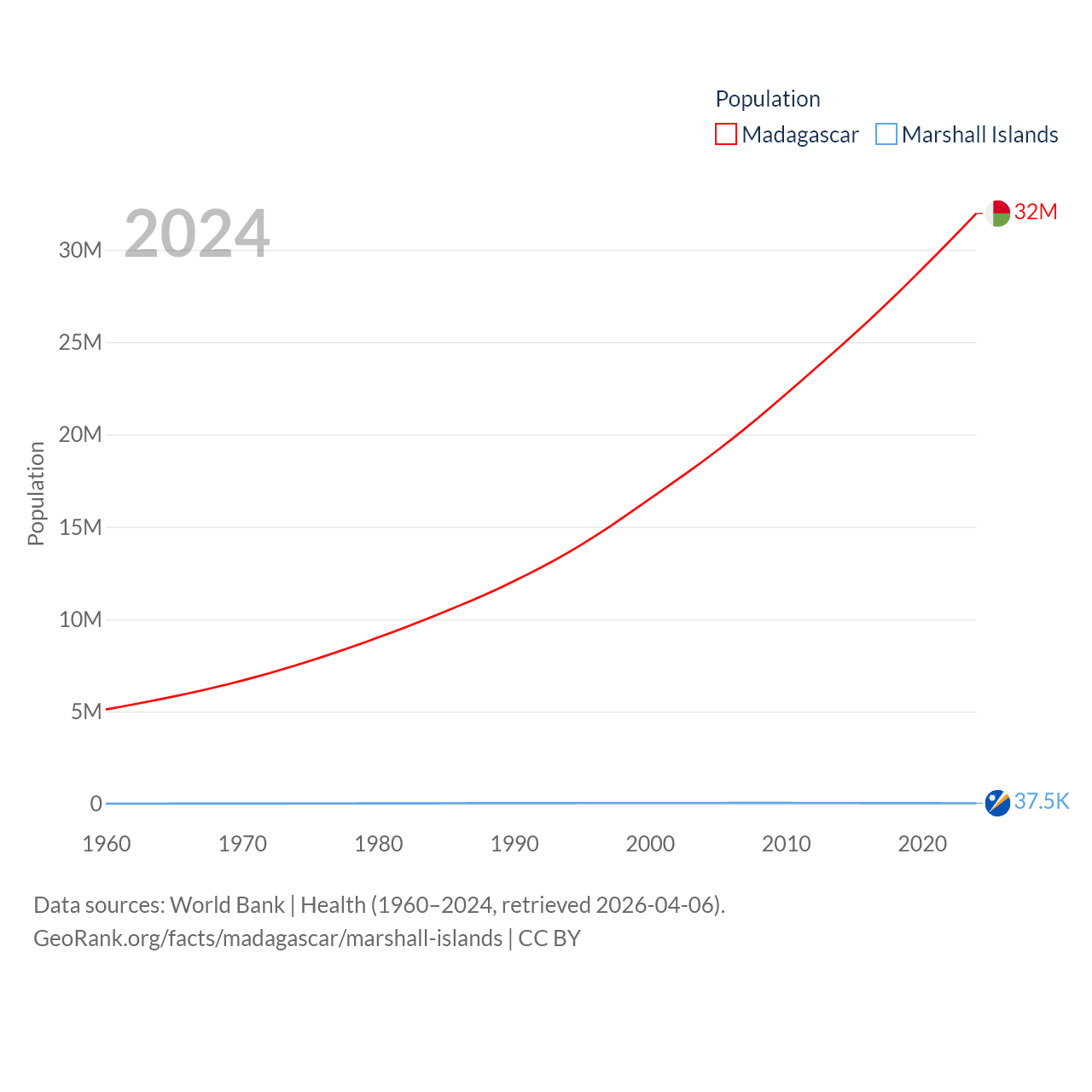 Madagascar has a population of 32M (ranked 49/197), compared with 37.5K in The Marshall Islands (ranked 192/197). Madagascar's land area is 224,634 sq mi versus 69.5 sq mi for The Marshall Islands (ranked 44th vs. 191st).