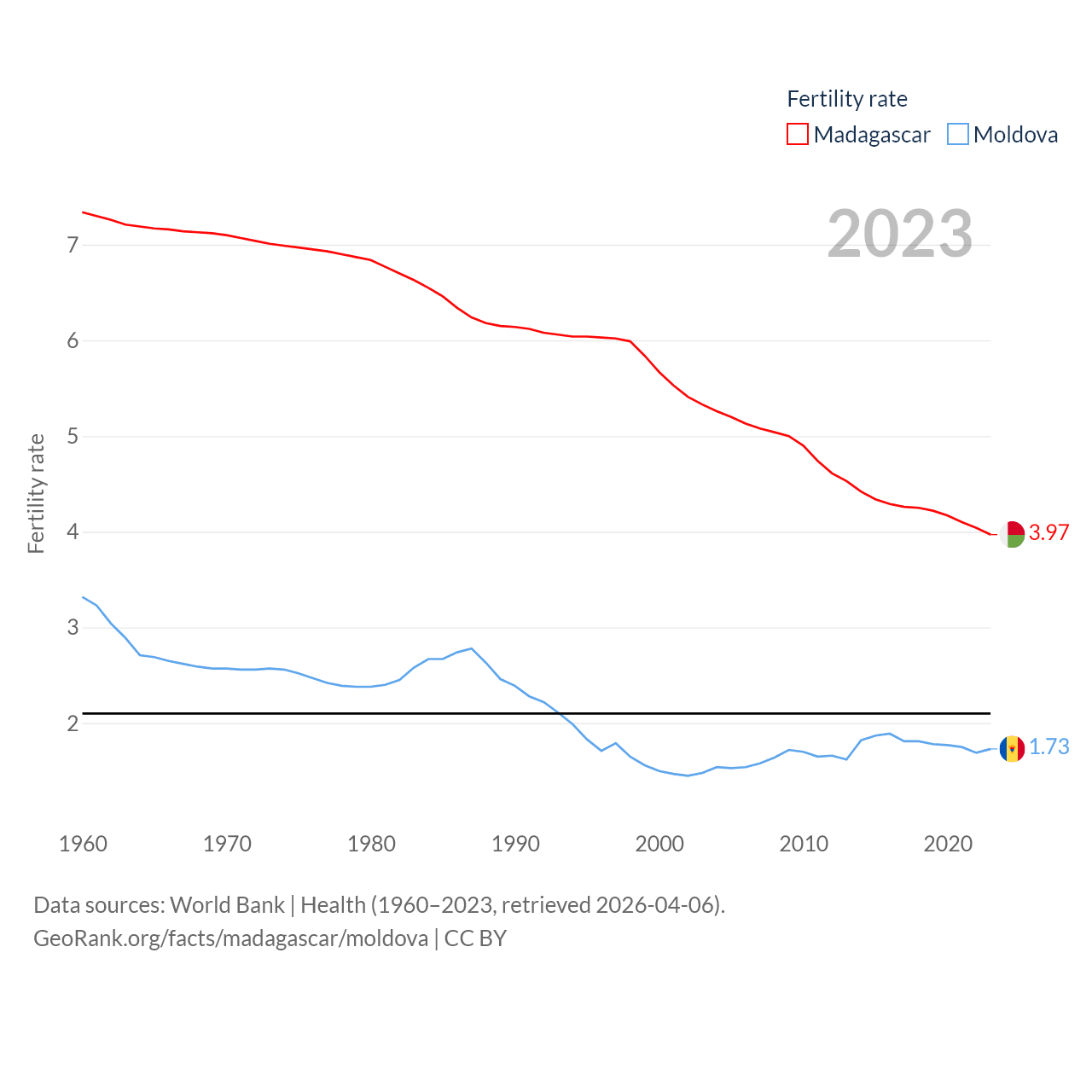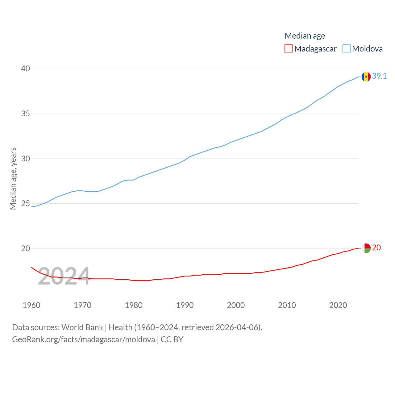 Madagascar has a population of 32M (ranked 49/197), compared with 2.4M in Moldova (ranked 143/197). Madagascar's land area is 224,634 sq mi versus 12,714 sq mi for Moldova (ranked 44th vs. 135th).