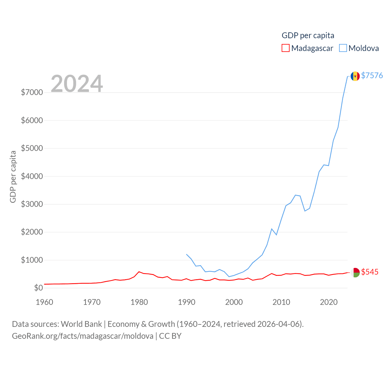 By GDP, Madagascar ranks 136/197 ($17.4B) and Moldova ranks 134/197 ($18.2B). By GDP per capita, Madagascar ranks 193/197 ($545), while Moldova ranks 99/197 ($7,576).