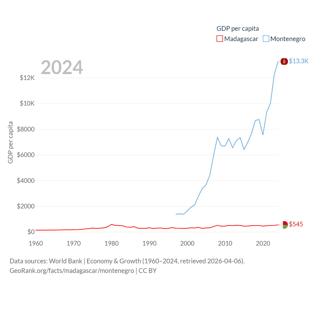By GDP, Madagascar ranks 136/197 ($17.4B) and Montenegro ranks 155/197 ($8.27B). By GDP per capita, Madagascar ranks 193/197 ($545), while Montenegro ranks 77/197 ($13,263).