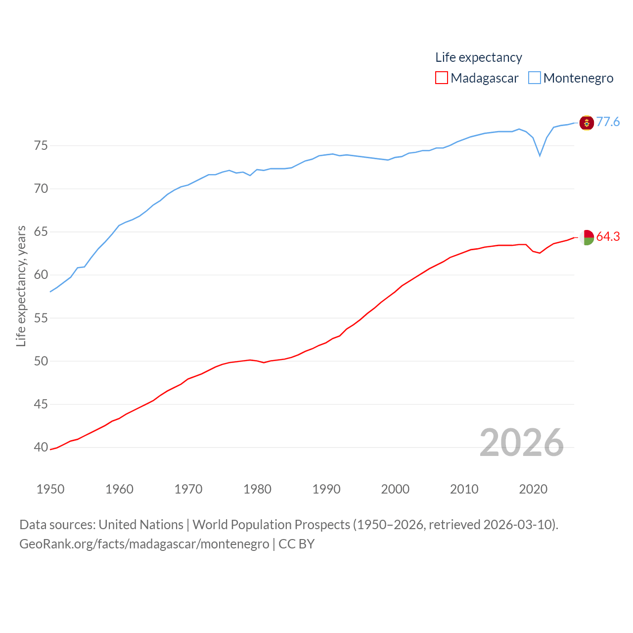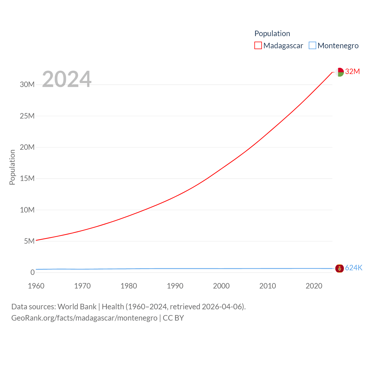 Madagascar has a population of 32M (ranked 49/197), compared with 624K in Montenegro (ranked 166/197). Madagascar's land area is 224,634 sq mi versus 5,193 sq mi for Montenegro (ranked 44th vs. 156th).