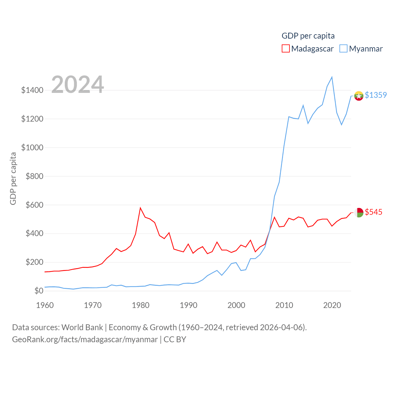By GDP, Madagascar ranks 136/197 ($17.4B) and Myanmar ranks 85/197 ($74.1B). By GDP per capita, Madagascar ranks 193/197 ($545), while Myanmar ranks 165/197 ($1,359).
