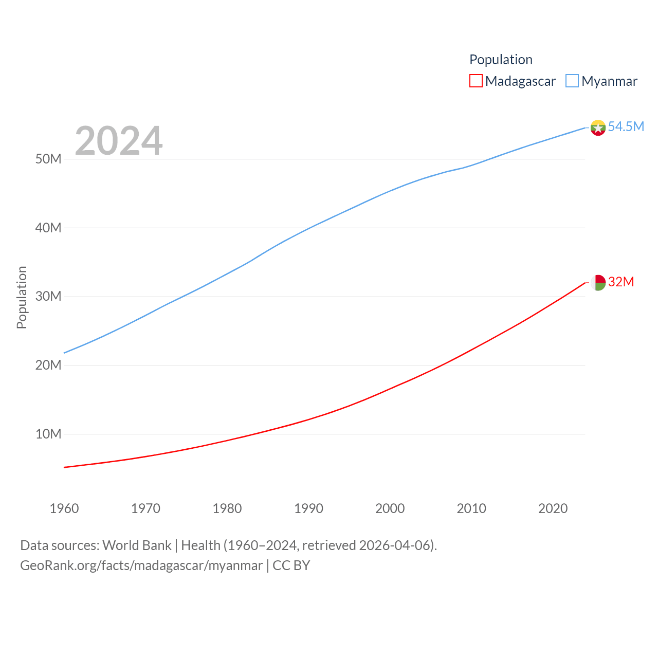Madagascar has a population of 32M (ranked 49/197), compared with 54.5M in Myanmar (ranked 27/197). Madagascar's land area is 224,634 sq mi versus 251,997 sq mi for Myanmar (ranked 44th vs. 39th).