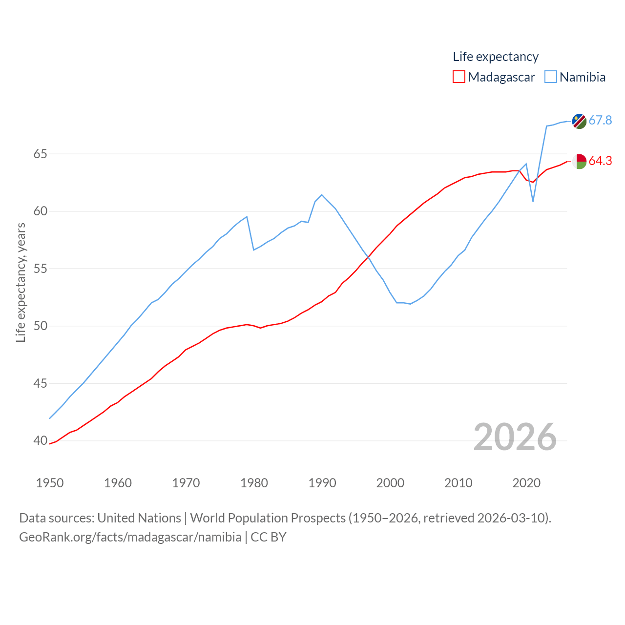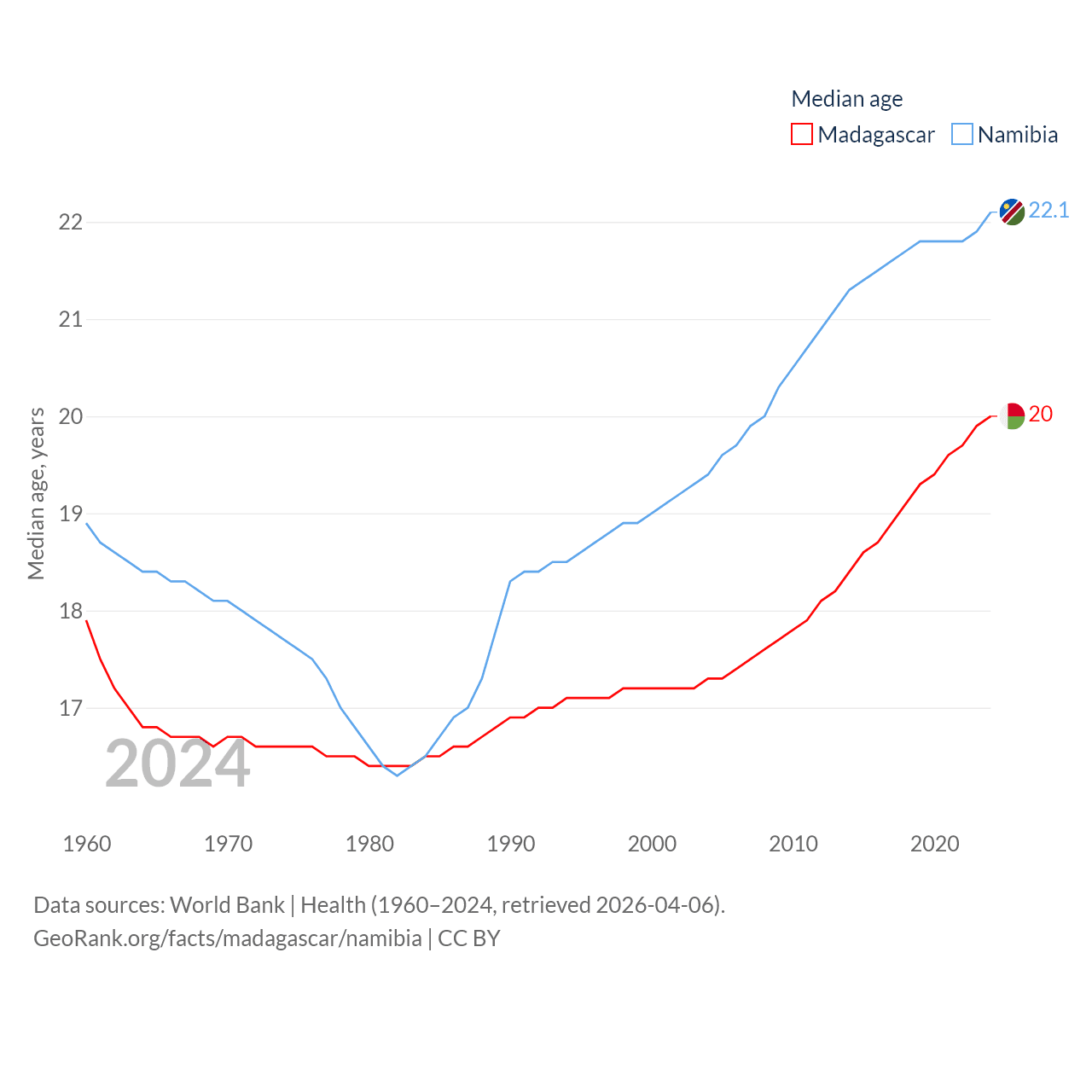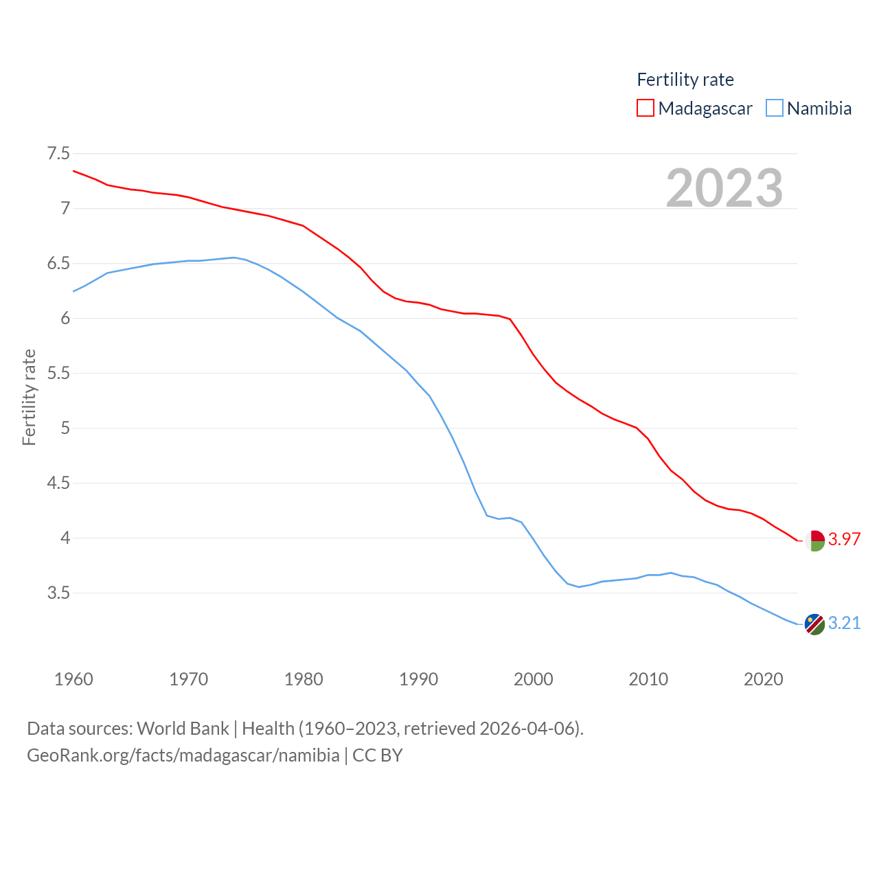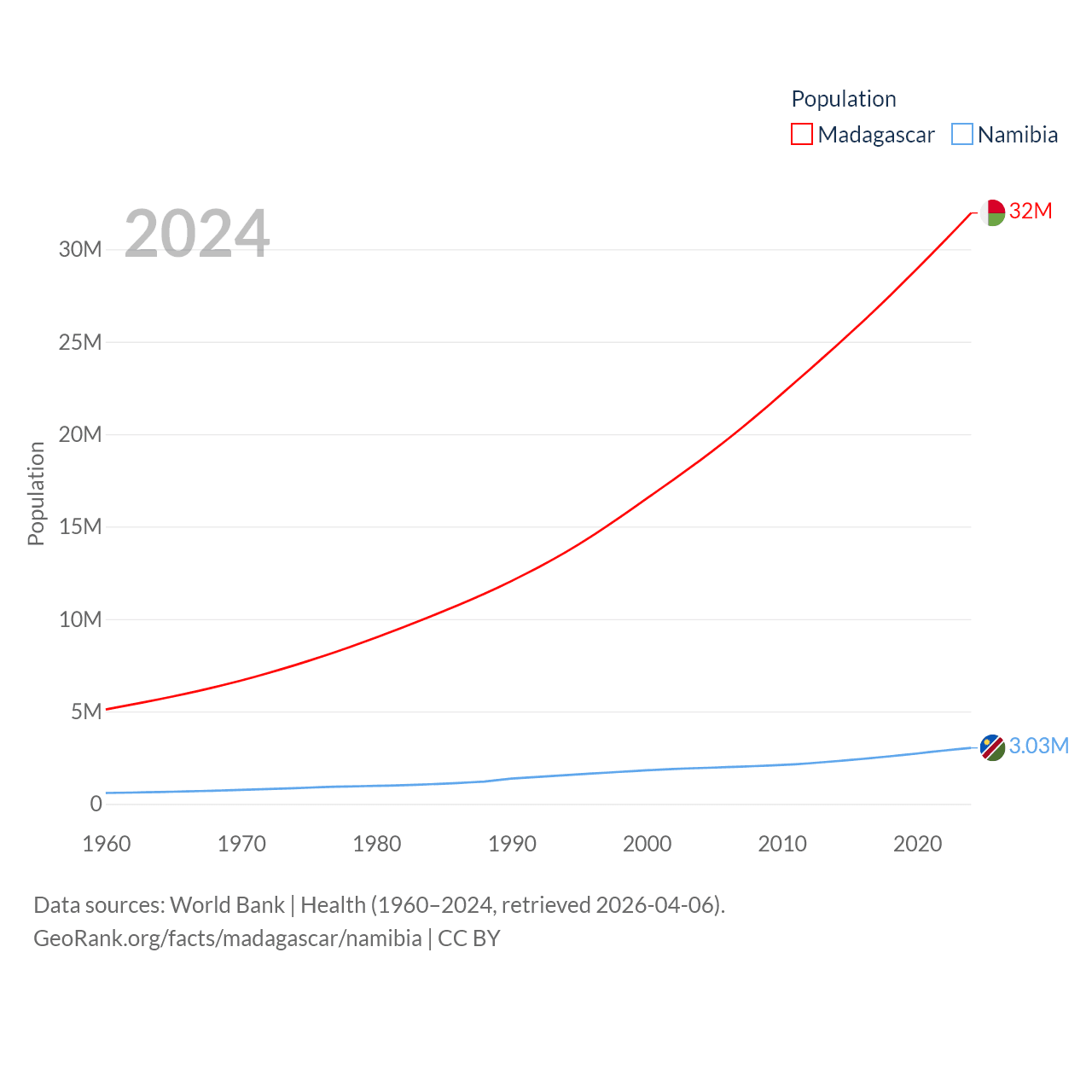 Madagascar has a population of 32M (ranked 49/197), compared with 3.03M in Namibia (ranked 136/197). Madagascar's land area is 224,634 sq mi versus 317,874 sq mi for Namibia (ranked 44th vs. 33rd).