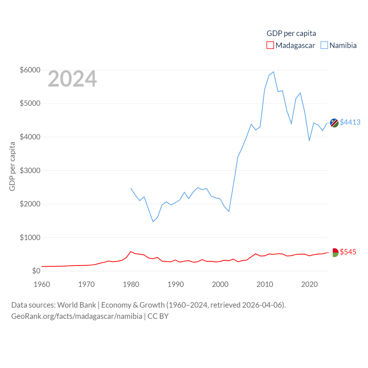 By GDP, Madagascar ranks 136/197 ($17.4B) and Namibia ranks 147/197 ($13.4B). By GDP per capita, Madagascar ranks 193/197 ($545), while Namibia ranks 126/197 ($4,413).