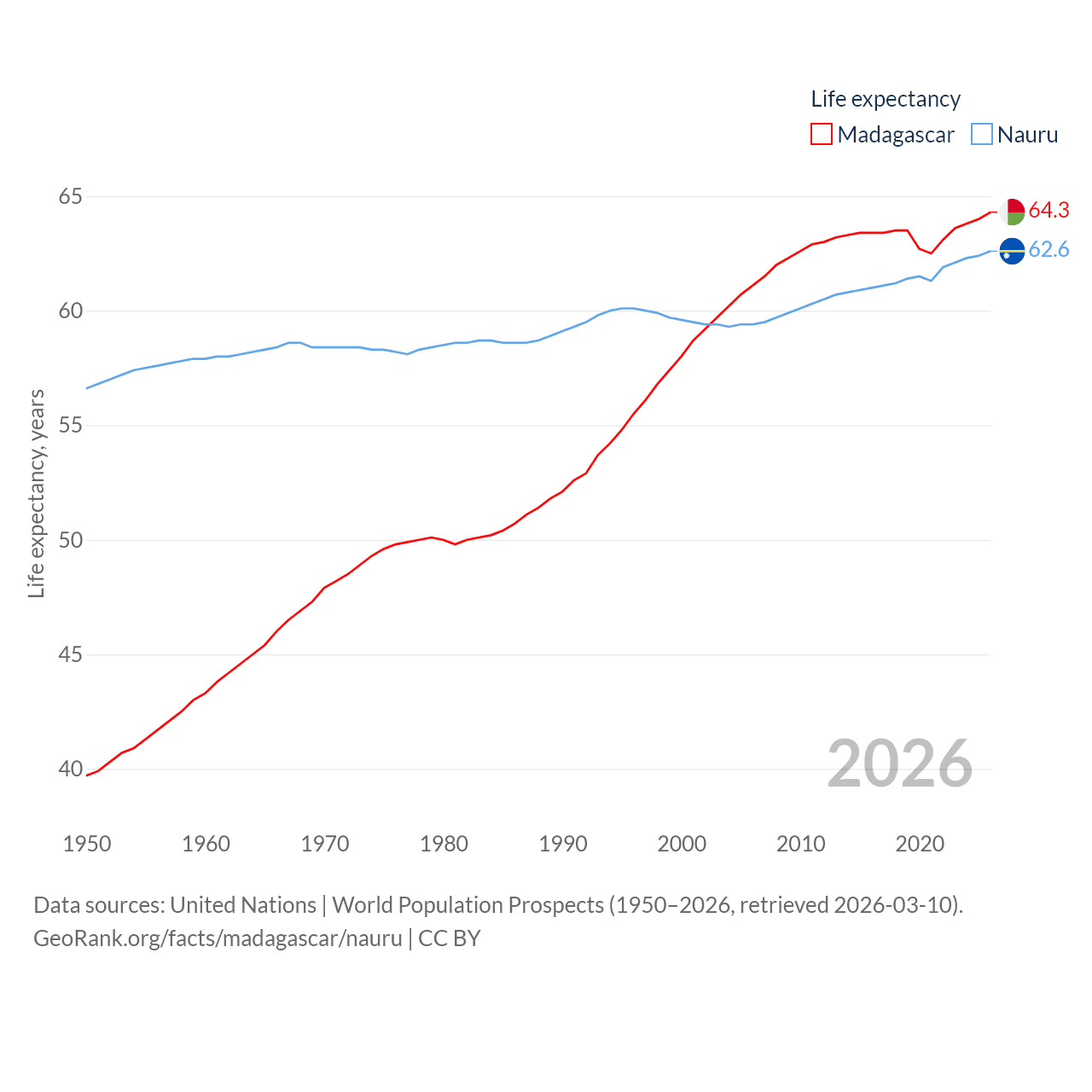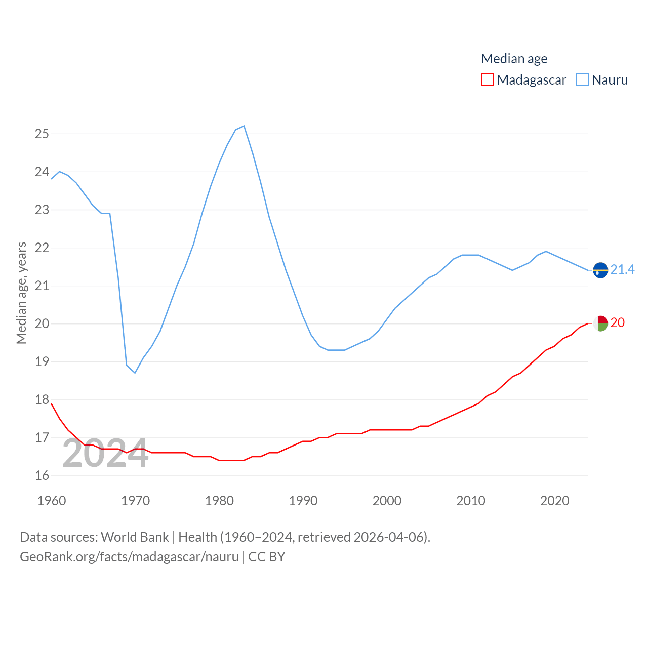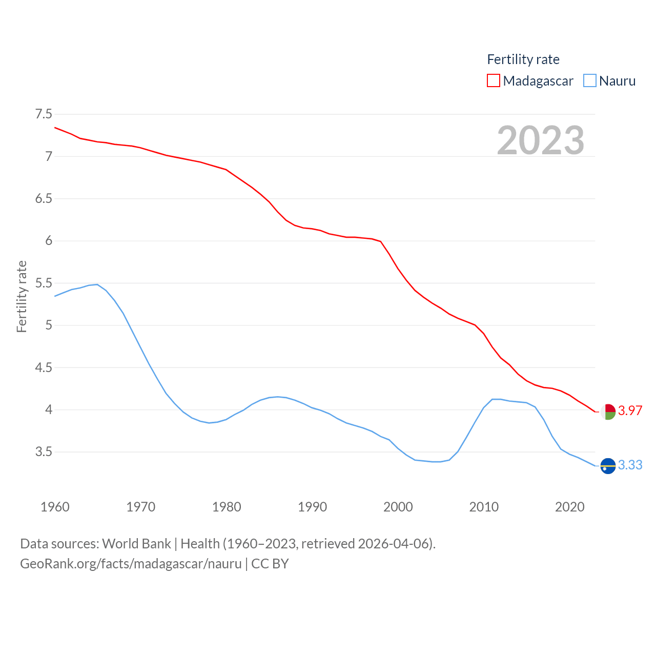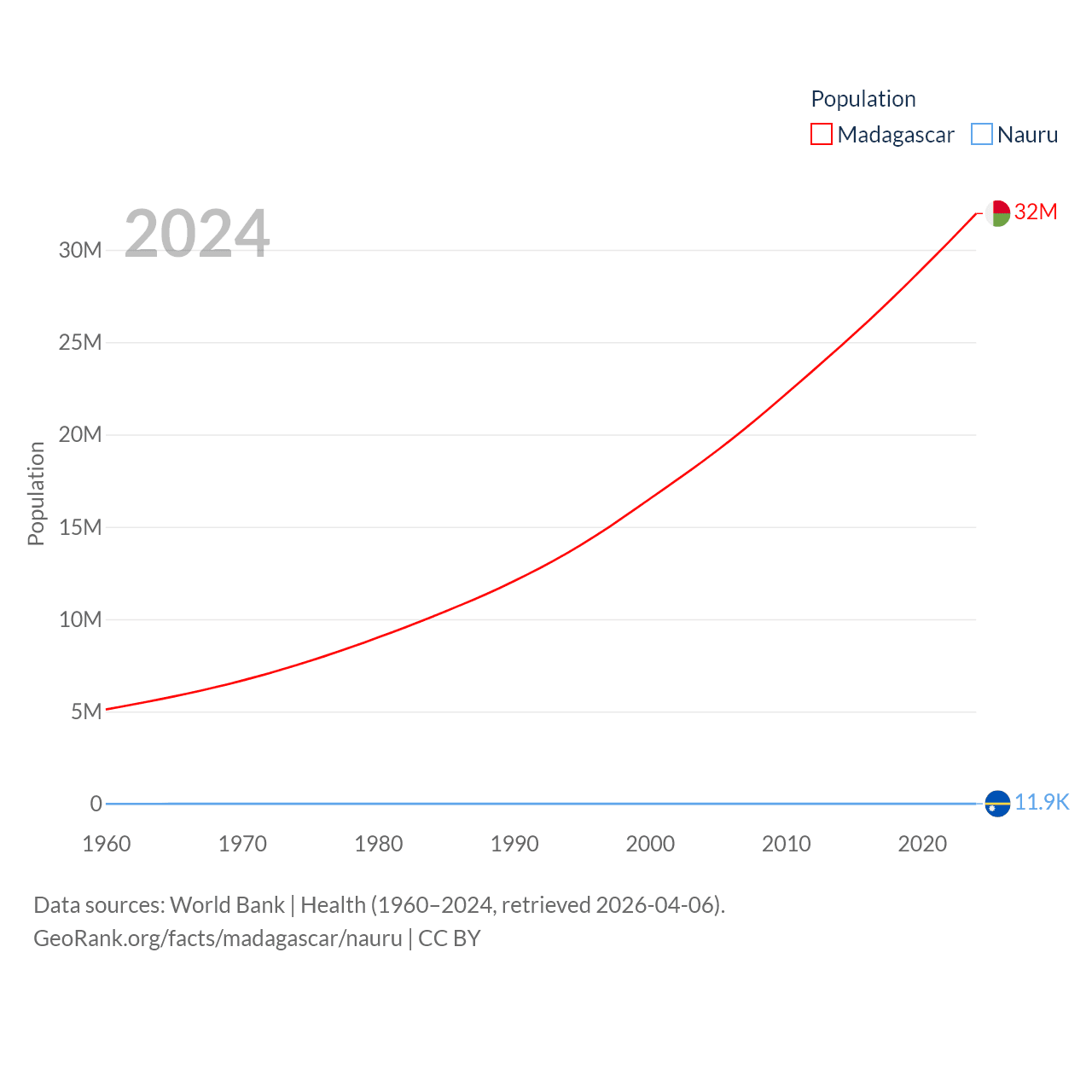 Madagascar has a population of 32M (ranked 49/197), compared with 11.9K in Nauru (ranked 195/197). Madagascar's land area is 224,634 sq mi versus 7.72 sq mi for Nauru (ranked 44th vs. 195th).