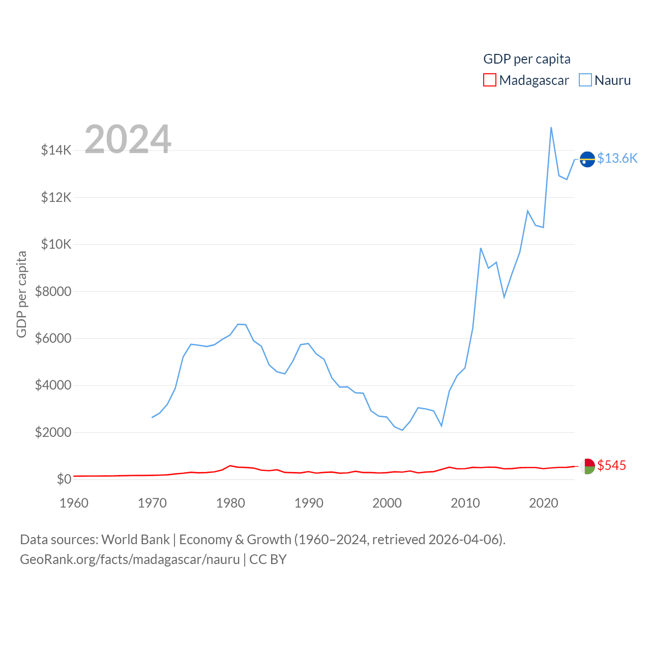 By GDP, Madagascar ranks 136/197 ($17.4B) and Nauru ranks 195/197 ($163M). By GDP per capita, Madagascar ranks 193/197 ($545), while Nauru ranks 74/197 ($13,609).