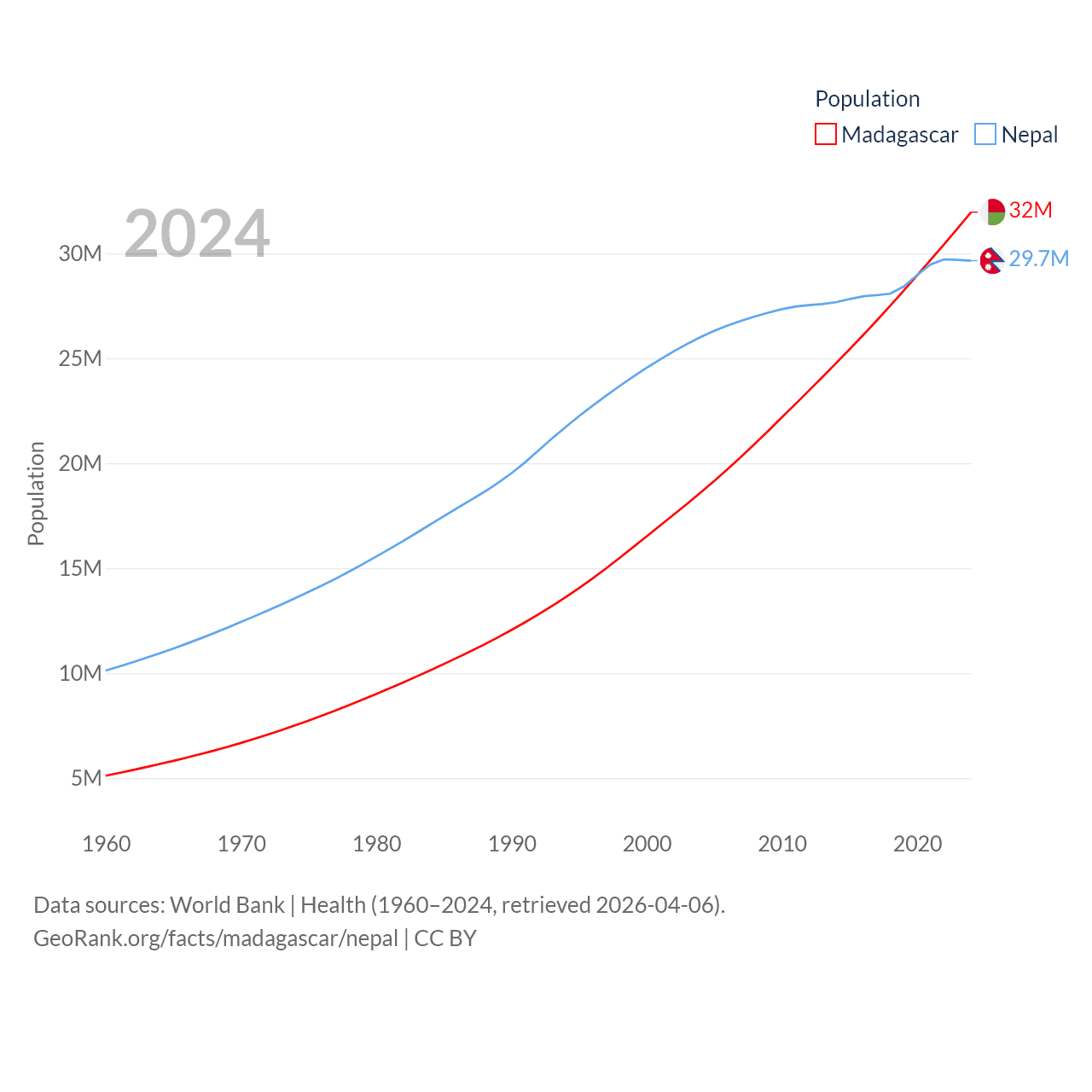 Madagascar has a population of 32M (ranked 49/197), compared with 29.7M in Nepal (ranked 51/197). Madagascar's land area is 224,634 sq mi versus 55,348 sq mi for Nepal (ranked 44th vs. 92nd).
