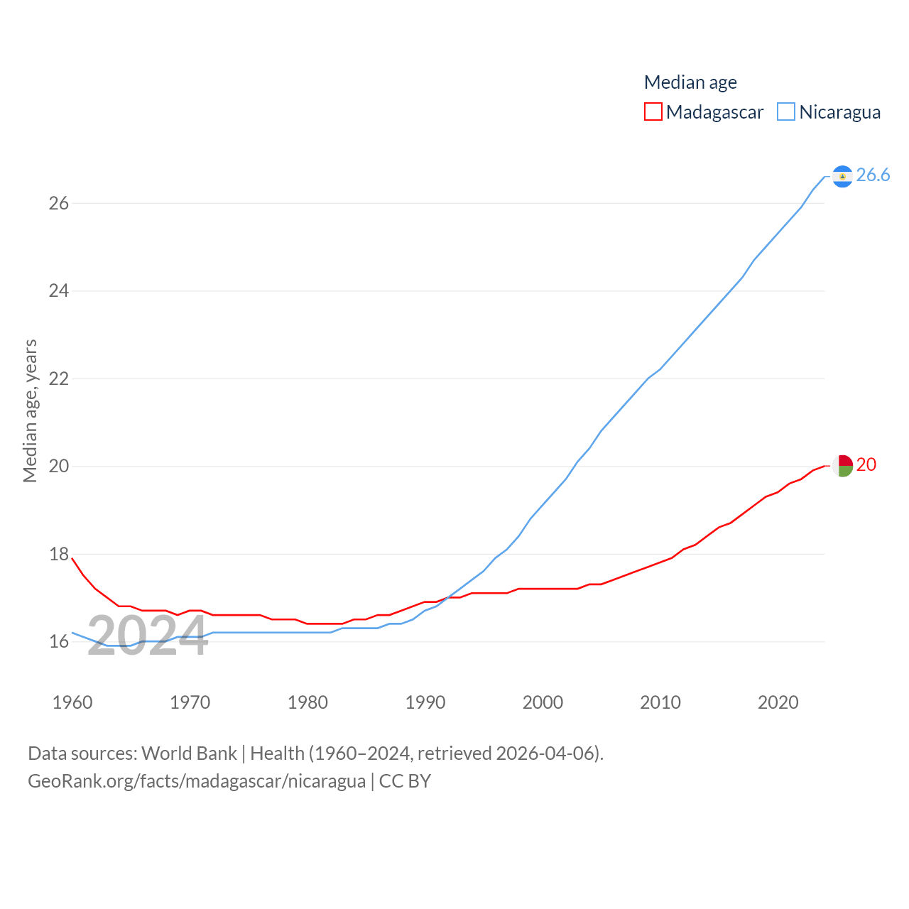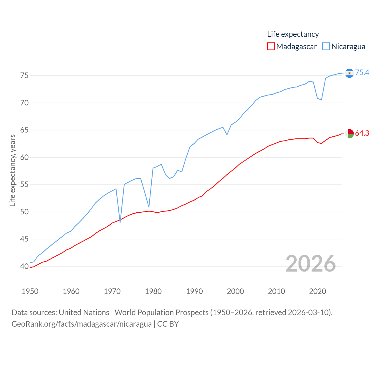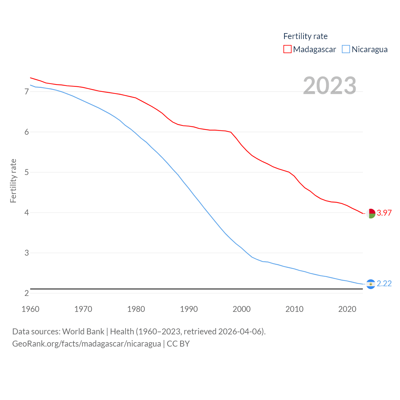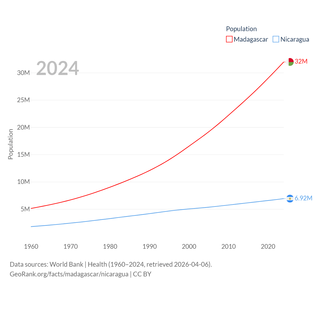 Madagascar has a population of 32M (ranked 49/197), compared with 6.92M in Nicaragua (ranked 108/197). Madagascar's land area is 224,634 sq mi versus 46,464 sq mi for Nicaragua (ranked 44th vs. 98th).