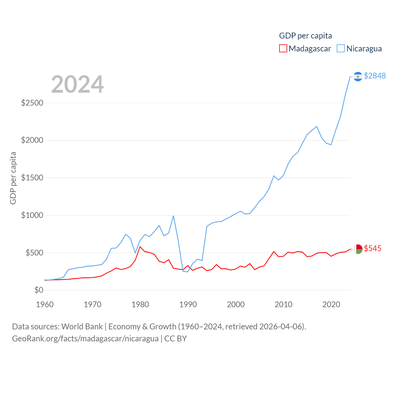 By GDP, Madagascar ranks 136/197 ($17.4B) and Nicaragua ranks 131/197 ($19.7B). By GDP per capita, Madagascar ranks 193/197 ($545), while Nicaragua ranks 141/197 ($2,848).