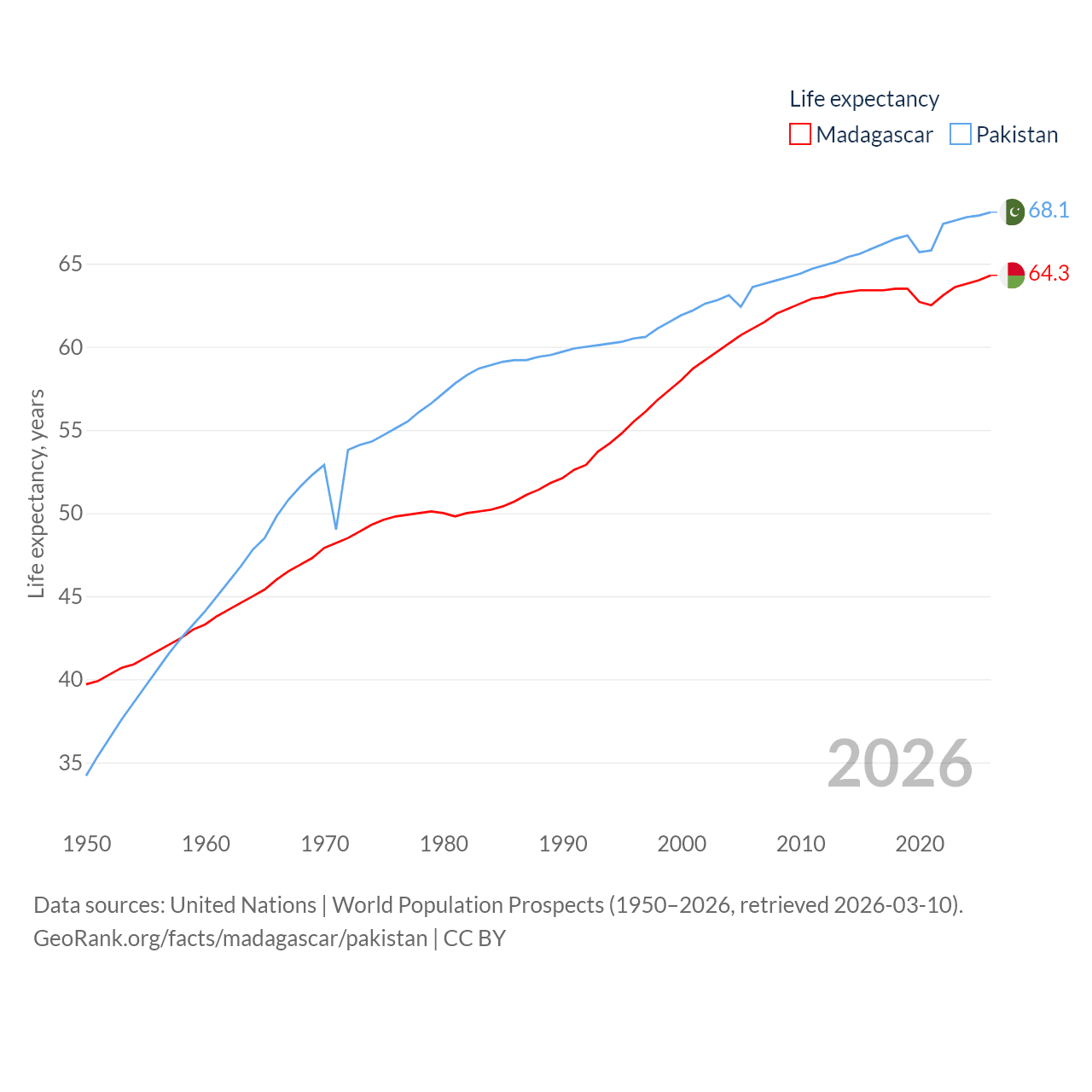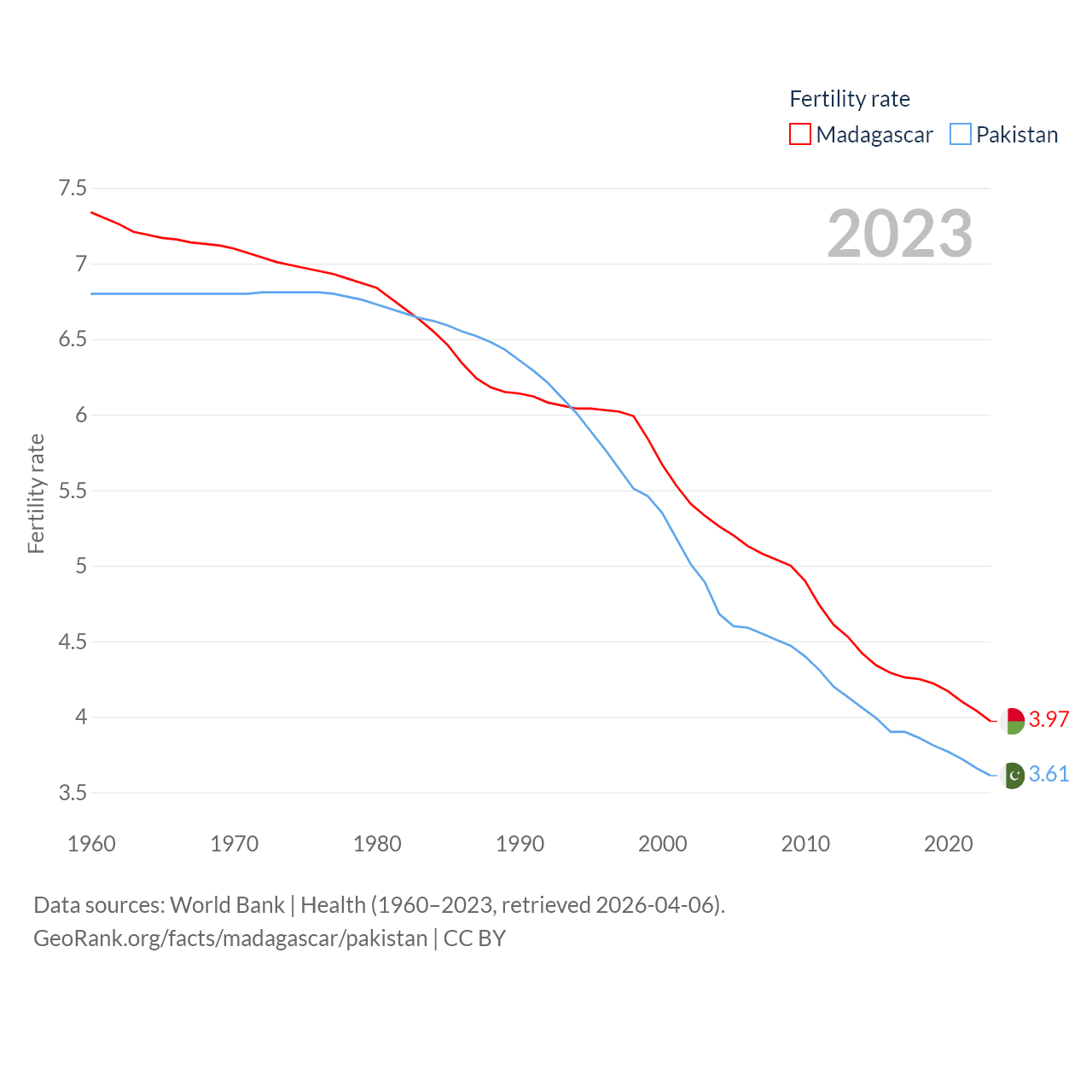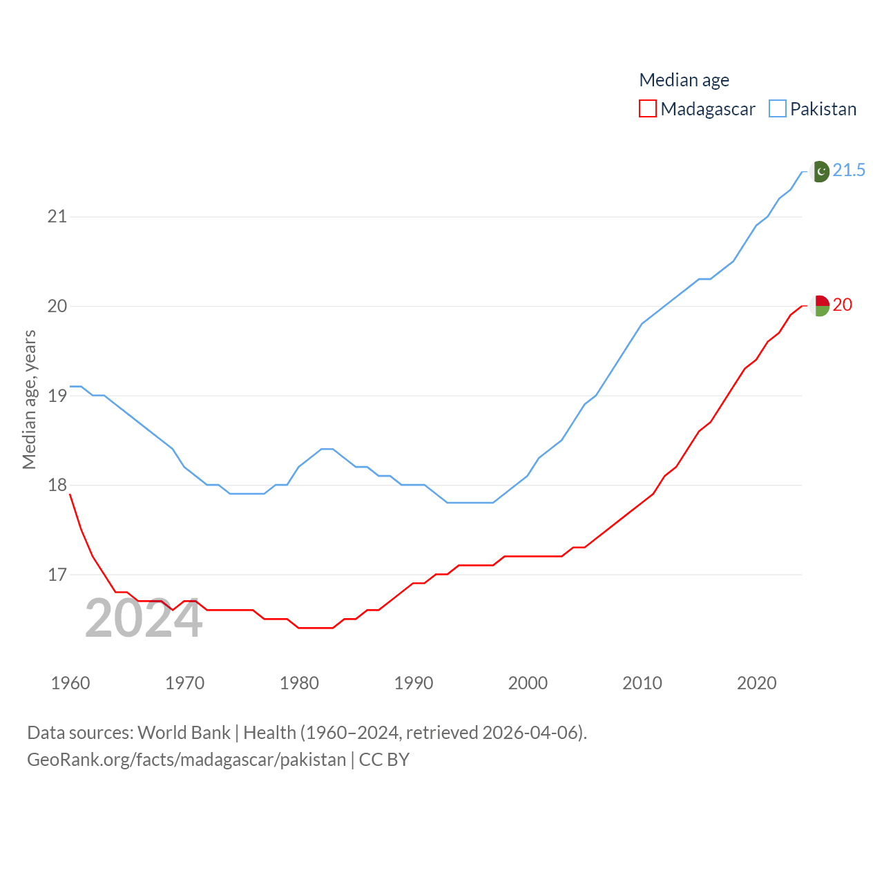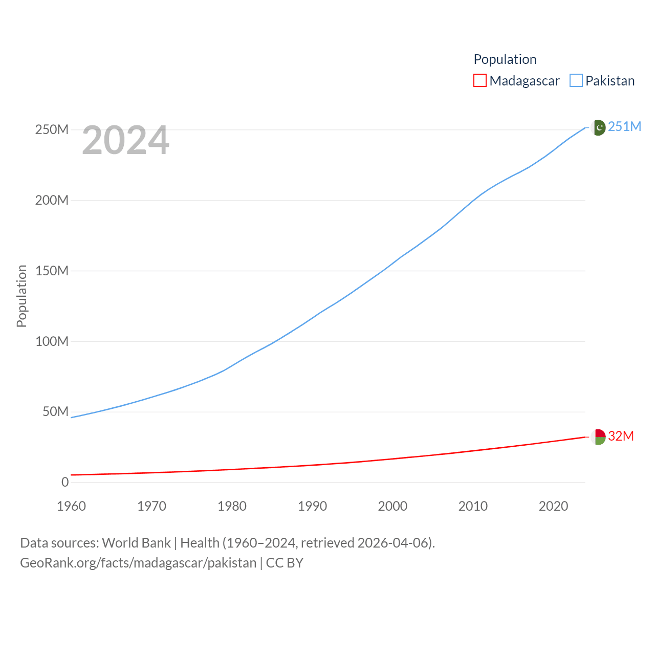 Madagascar has a population of 32M (ranked 49/197), compared with 251M in Pakistan (ranked 5/197). Madagascar's land area is 224,634 sq mi versus 297,638 sq mi for Pakistan (ranked 44th vs. 35th).