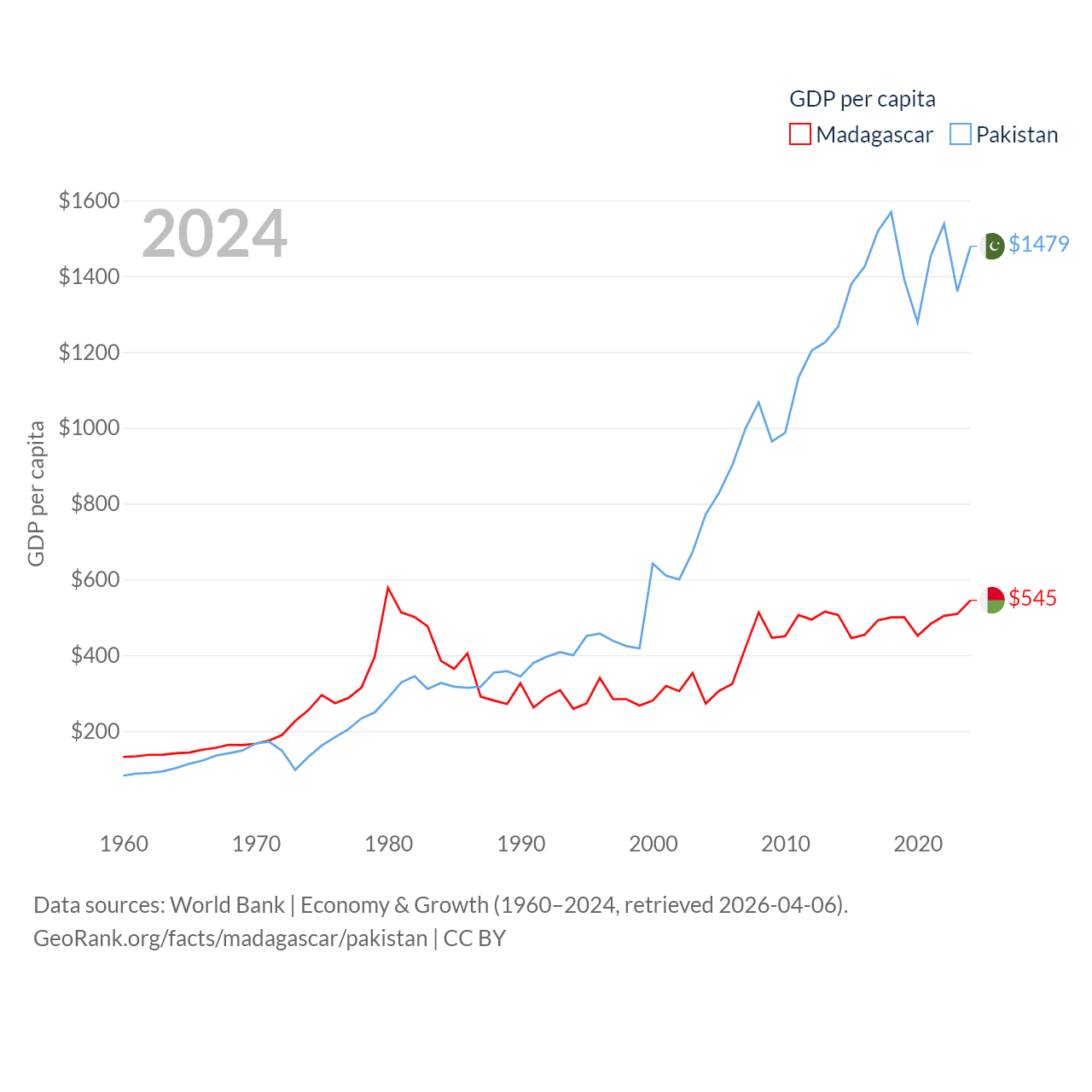 By GDP, Madagascar ranks 136/197 ($17.4B) and Pakistan ranks 43/197 ($372B). By GDP per capita, Madagascar ranks 193/197 ($545), while Pakistan ranks 163/197 ($1,479).