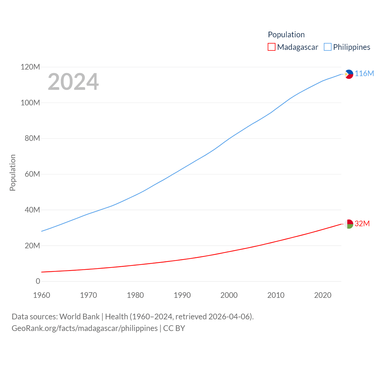 Madagascar has a population of 32M (ranked 49/197), compared with 116M in The Philippines (ranked 14/197). Madagascar's land area is 224,634 sq mi versus 115,124 sq mi for The Philippines (ranked 44th vs. 71st).