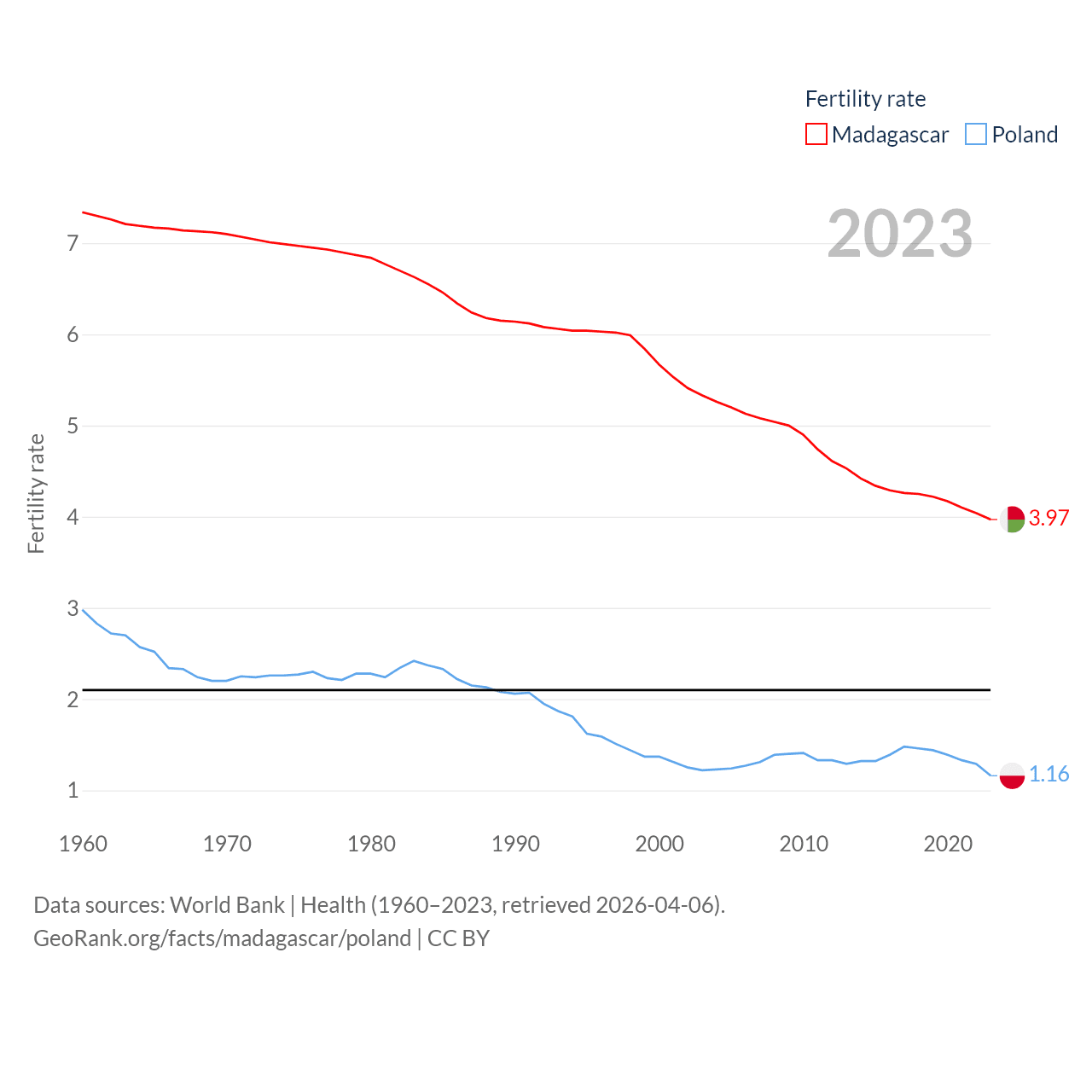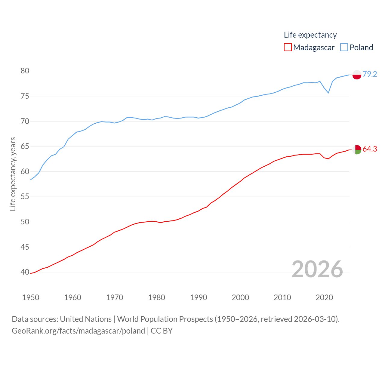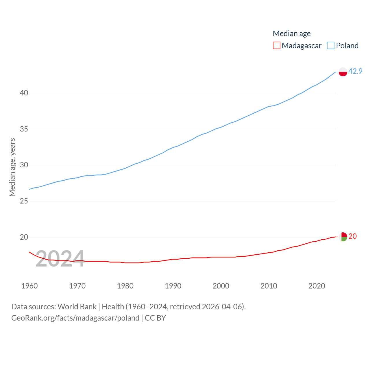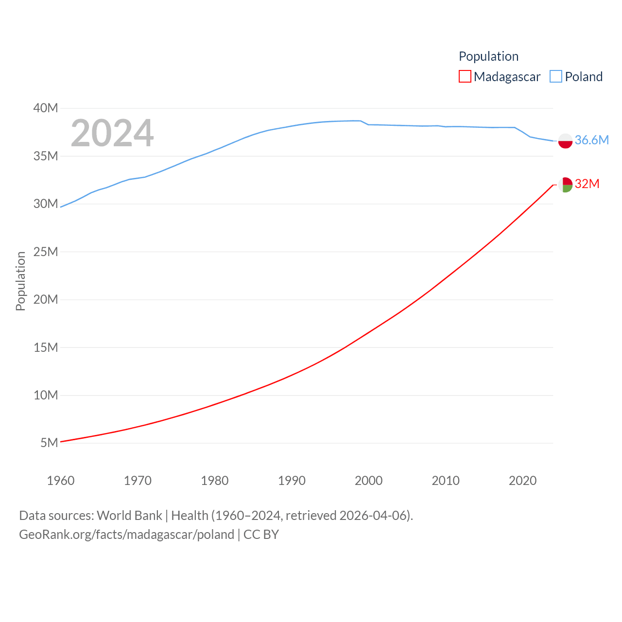Madagascar has a population of 32M (ranked 49/197), compared with 36.6M in Poland (ranked 42/197). Madagascar's land area is 224,634 sq mi versus 118,252 sq mi for Poland (ranked 44th vs. 69th).
